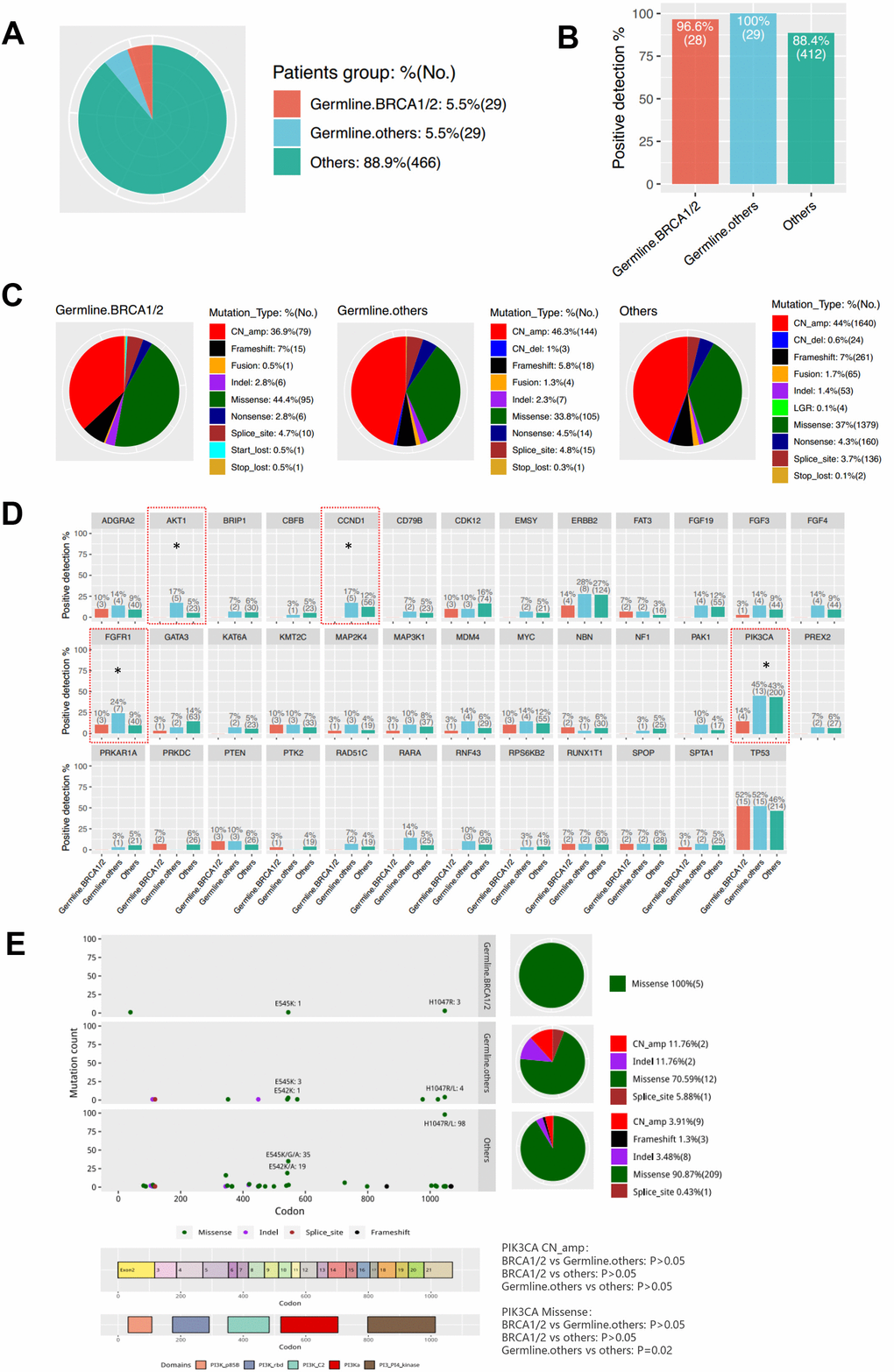 Next, we divided the patients into three groups according to germline mutations: Germline-BRCA1/2, Germline-others (non-BRCA) and Others (non-carriers) (Figure 4A). There was no difference in the somatic mutation detection rate among the three groups (Figure 4B). Then, we analyzed the distribution of mutation types among the three groups (Figure 4C). Germline-BRCA1/2 group had significantly more missense mutations (P=0.02) and less copy number amplification (P=0.04) than the Germline-others group. Meanwhile, mutation types between Germline-others group and Others group were not statistically different (P>0.05). Moreover, the mutation rates of AKT1, CCND1, FGFR1, and PIK3CA were different among the three groups (Figure 4D and Supplementary Table 5). Mutations in AKT1 and CCND1 were not detected in the Germline-BRCA1/2 group. FGFR1 mutation rate was 24% in Germline-others group, 10% in Germline- BRCA1/2 group, and 9% in Others group. The PIK3CA mutation rate was significantly lower in Germline- BRCA1/2 group than the other two groups (Germline-BRCA1/2 vs Germline-others P=0.02; Germline-BRCA1/2 vs Others P=0.002). As shown in Figure 4E, PIK3CA H1047R was the hotspot mutation detected from all three groups. The Others group had significantly more missense PIK3CA mutations than the Germline-others group (P=0.02).