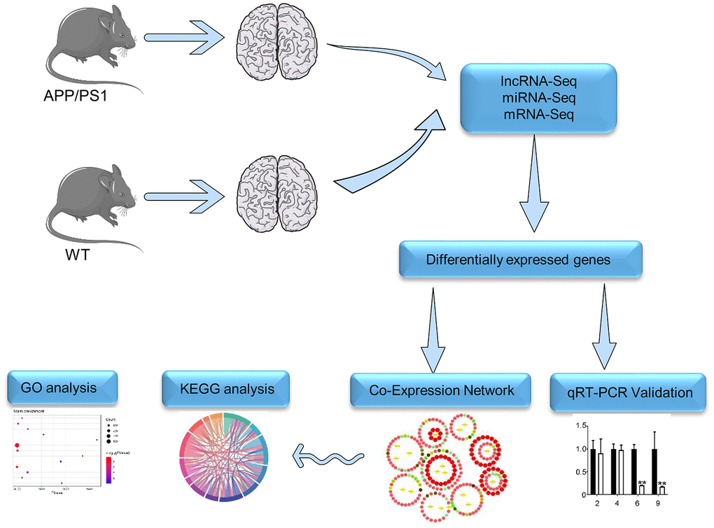 The rational strategy to gain insight into neurodegenerative diseases such as AD would make the study of lncRNA-associated ceRNA networks comprehensively. The elucidation of lncRNA-associated ceRNA networks in AD might help to develop new therapeutic targets for AD. In APP/PS1 mice which express APP695swe and PS1-dE9 mutations, Aβ can be detected in 6-month old mice, and then extracellular Aβ deposits in the cortex are apparent in 9-month old mice. Moreover, synaptic transmission and long-term potentiation are clearly impaired in 9-month old mice [24]. Thus, deep RNA-seq was performed in this study to find lncRNA-associated ceRNA networks in the brain of APP/PS1 mice together with the wild-type (WT) control mice at the 6- and 9-month-old stages. RNA-seq is widely used to determine the differential gene-expression profiles that underlie phenotypic differences [25, 26]. The data by RNA-seq identifies lncRNA-associated ceRNA networks in the APP/PS1 mouse model of AD (Figure 1), which can contribute to the development of new therapeutic targets and novel diagnostic methods for AD.