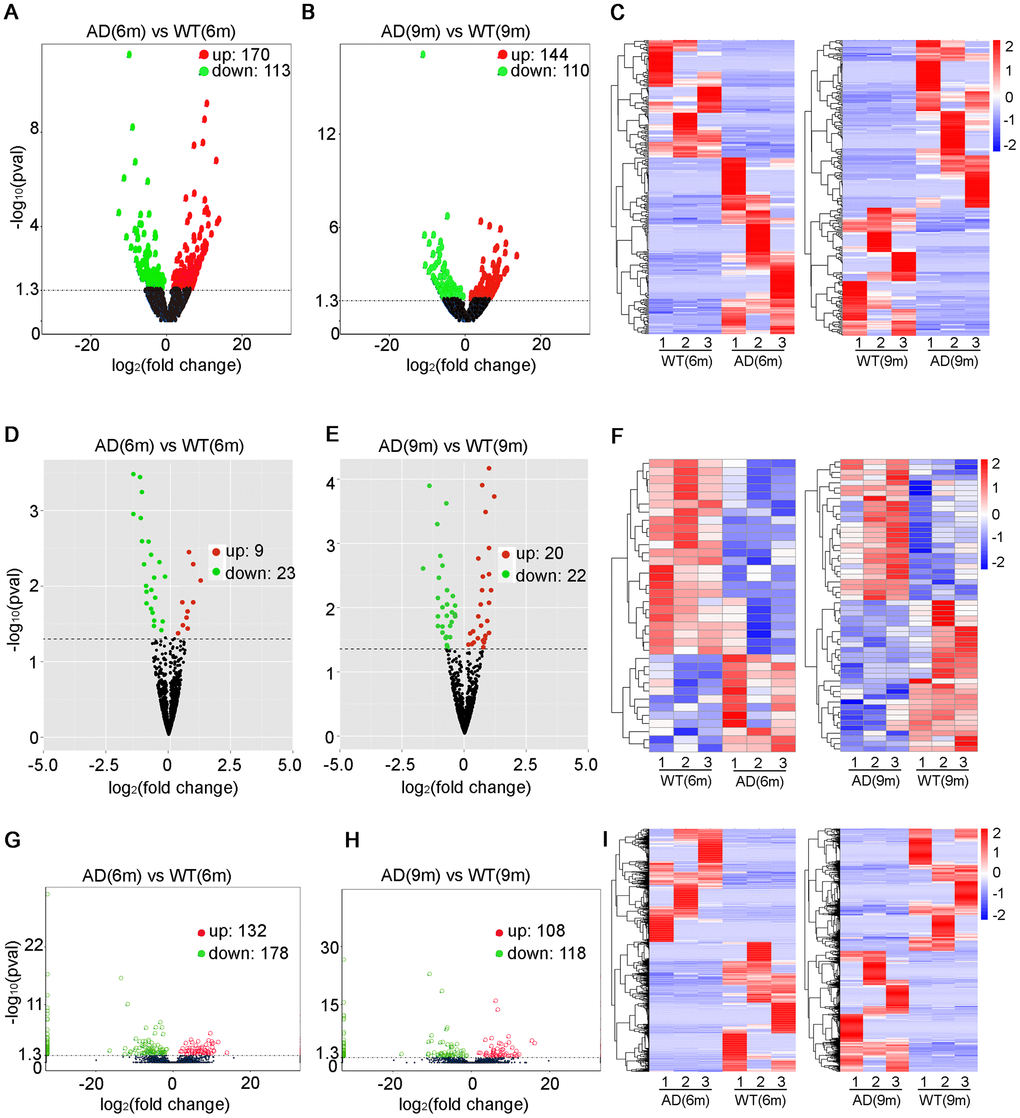 283 significantly dysregulated lncRNA transcripts (including 170 upregulated transcripts and 113 downregulated transcripts) were identified in the 6-month-old APP/PS1 mice (Figure 2A, Supplementary Table 1), while 254 significantly dysregulated lncRNA transcripts (including 144 upregulated transcripts and 110 downregulated transcripts) were identified in the 9-month-old APP/PS1 mice (Figure 2B, Supplementary Table 2). A heatmap was constructed to visualize the cluster analysis results of the lncRNAs expression (Figure 2C). Then based on the transcripts per million (TPM) values, 32 significantly dysregulated miRNAs were identified between the 6-month-old groups, which included 9 upregulated miRNAs and 23 downregulated miRNAs in APP/PS1 mice (Figure 2D, Supplementary Table 3). 42 miRNAs were significantly dysregulated between the 9-month-old groups, which included 20 upregulated miRNAs and 22 downregulated miRNAs in APP/PSI mice (Figure 2E, Supplementary Table 4). The cluster analysis of miRNAs expression was performed, and then a heatmap was generated (Figure 2F). Finally, the FPKM values (fragments per kilobase of exons per million fragments mapped) were used to estimate the expression levels of mRNA transcripts. 310 mRNA transcripts were significantly dysregulated, including 132 upregulated transcripts and 178 downregulated transcripts in APP/PS1 mice at 6 months (Figure 2G, Supplementary Table 5), while 226 mRNAs were significantly dysregulated, with 108 and 118 upregulated and downregulated in APP/PS1 mice at 9 months (Figure 2H, Supplementary Table 6). Once, cluster analysis for the expression of mRNAs was performed and a heatmap was generated (Figure 2I).