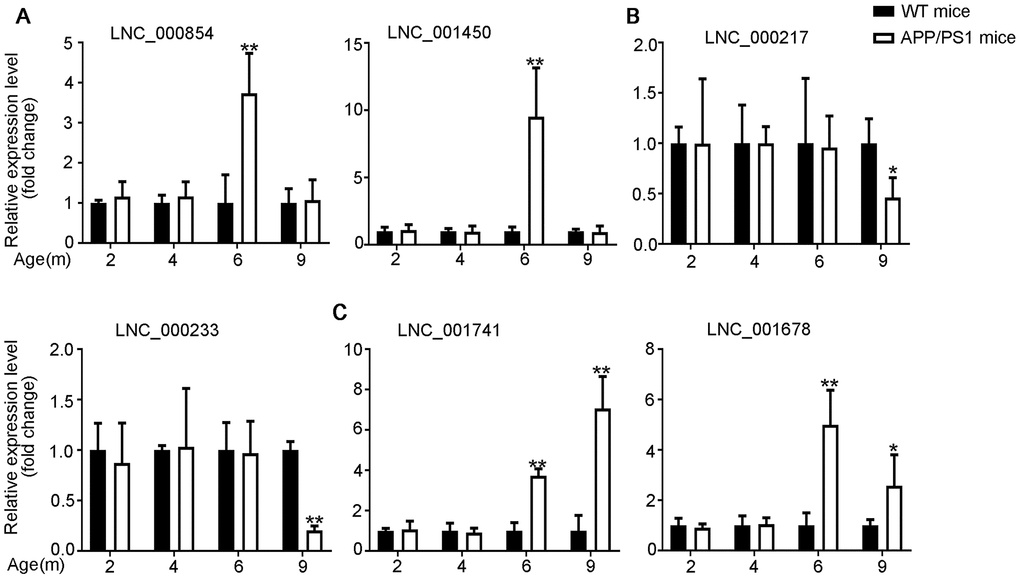 The differential expression identified by RNA-seq experiments were confirmed with qPCR. 24 differentially expressed transcripts were randomly selected, including 6 lncRNAs, 9 miRNAs and 9 mRNAs. All of the selected transcripts were detected in the brain of 2–9-month-old APP/PS1 and WT mice. Besides, there was statistical difference between the two groups (Figures 3–5). Overall, the qPCR results were highly consistent with the RNA-seq data.
