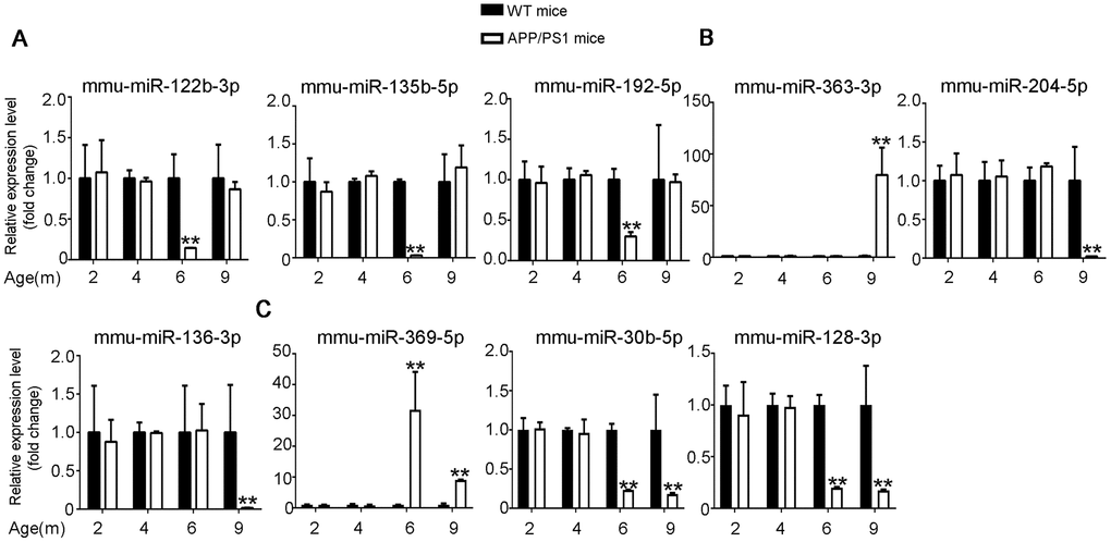 A total of 99,137,837 raw reads were generated. 28,672,205 raw reads and 20,760,197 were generated for 6-month-old WT and APP/PS1 mice respectively, while 23,016,993 raw reads and 26,688,442 raw reads were generated for 9-month-old WT and APP/PS1 mice respectively. After the removal of low quality and adapter sequences, 96,028,757 clean reads were obtained. 27,710,151 clean reads and 20,281,596 clean reads were obtained for 6-month-old WT and APP/PS1 mice respectively, while 22,393,001 clean reads and 25,644,009 clean reads were obtained for 9-month-old WT and APP/PS1 mice respectively. These clean reads were filtered by length (18–35 nucleotides), and a majority of the selected reads for both groups were 22 nucleotides in length. The selected reads were then mapped to the mouse reference sequence with Bowtie [32], and the mapping rate was 94.61% and 94.78% for APP/PS1 and WT mice respectively. Then, the mapped tags were then annotated and classified by alignment with noncoding small RNAs (including rRNA, tRNA, small nuclear RNA, and small nucleolar RNA), repeat-associated RNA, exon- and intron-associated RNAs in GenBank before sequenced in the miRBase v.20.0. In addition, both miREvo [33] and miRDeep2 [34] software was used to predict previously unidentified miRNAs. Ultimately, 1,411 mature miRNAs (1,312 known and 99 previously unknown) were detected and used for subsequent analyses.