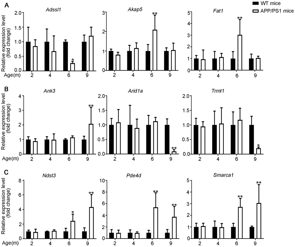 WT and APP/PS1 mice [originally from The Jackson Laboratory; strain B6.Cg-Tg(APPswe, PSEN1dE9) 85Dbo/Mmjax [43]] were purchased from the Model Animal Research Center of Nanjing University. The mice were housed one per cage under standard conditions (25°C, 50% humidity, a 12-hour light/dark cycle, and specific-pathogen-free environment). The mice were provided with free access to the standard diet until they met the age requirements (6 and 9 months). 3 AD and 3 wild-type male mice born in the same litter were used as experimental and control groups, of which cerebral cortex samples were collected for RNA-seq. All animal experiments were performed in accordance with animal use protocols approved by the Committee for the Ethics of Animal Experiments, Shenzhen Peking University, the Hong Kong University of Science and Technology Medical Center (SPHMC) (protocol number 2011-004).