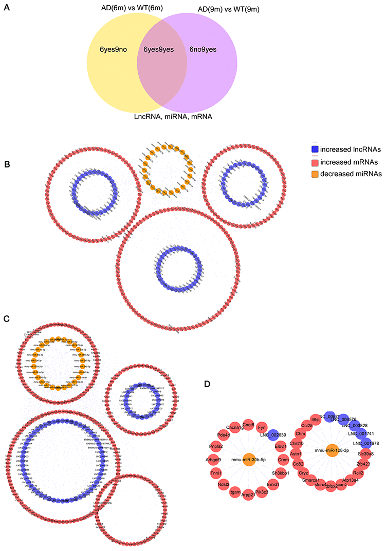 According to the ceRNA hypothesis, the ceRNAs can compete for the same MREs in regulatory networks. In this study, RNA-seq data were used to map ceRNA networks in the APP/PS1 brain for the first time. The differentially expressed transcripts (lncRNAs, miRNAs, and mRNAs) were split into three groups depending on the expression patterns. The 6yes9no group included transcripts differential expressed at 6 months but not differential expressed at 9 months of age, play a role in AD pathogenesis; The 6no9yes group included transcripts not differential expressed at 6 months but differential expressed at 9 months, participate in the development of AD; The 6yes9yes group included transcripts differential expressed at both 6 and 9 months, which contributed to in all stages of AD (Figure 6A).