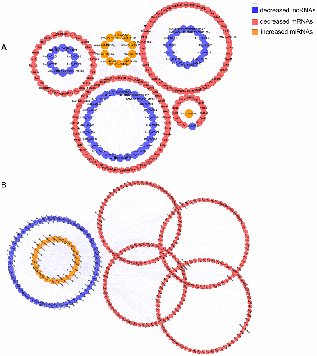 The lncRNA-associated ceRNA networks were constructed and visually displayed by using Cytoscape software V3.5.0 (San Diego, CA, USA) based on the analysis of high-throughput sequencing data, as described above. In the figures, distinct shapes and colors are used to represent different RNA types, and regulatory relationships.