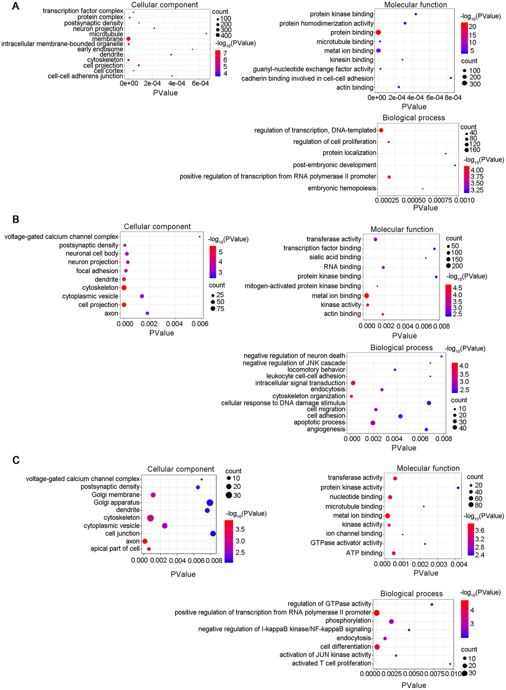 A lncRNA-associated ceRNA network can alter the regulation of related mRNA-encoding genes. GO analyses were performed on the genes included in the networks identified here and several GO terms were found to be significantly enriched (Supplementary Tables 12–14). The GO terms included biological process (BP), cellular component (CC), and molecular function (MF), as shown in Figure 8. The top highly enriched terms were cytoskeleton (GO:0005856), postsynaptic density (GO:0014069), cell-cell adherens junction (GO:0005913) and dendrite (GO:0030425). A number of cognition-associated terms were also observed, such as axon (GO:0030424), synapse (GO:0045202), postsynaptic density (GO:0014069), intracellular signal transduction (GO:0035556), and neuron projection (GO:0043005). Noteworthy, the enriched GO terms for 6yes9no group were different from those for 6no9yes group, which suggested the expression changes in the functional genes during the progression of disease. For example, the Go pathways "transferase activity" was found in the "Molecular function" section of both B and C, but not in A of the Figure 8. It was explained that AD is characterized by the accumulation of intracellular and extracellular proteins, including the microtubule-associated protein Tau and the decomposition product of amyloid precursor protein β-amyloid Aβ. Tissue-type transglutaminase (tTG) is a calcium-dependent enzyme that catalyzes the cross-linking of proteins to generate isomeric peptides of the γ-glutamyl-ε-lysine structure (representing transferase activity). This covalent attachment results in protein aggregation and deposition due to its strong resistance to proteolysis. In previous studies it was demonstrated that the protein levels of tTG and isopeptides were increased in the brain of patients with advanced AD, and the activity increases noticeably with age. These findings suggest that tTG may be an important cause of abnormal protein accumulation in advanced AD pathology, which may not have been changed in the early stages [35, 36]. Consequently, 6yes9no group is not enriched in this pathway. In summary, the lncRNA-associated ceRNA networks might participate in the pathological progression of AD at distinct stages through different mechanisms. The establishment of these networks helps to investigate the functions of the key genes in AD and to guide determination of the regulatory mechanisms between the components of the ceRNA network.
