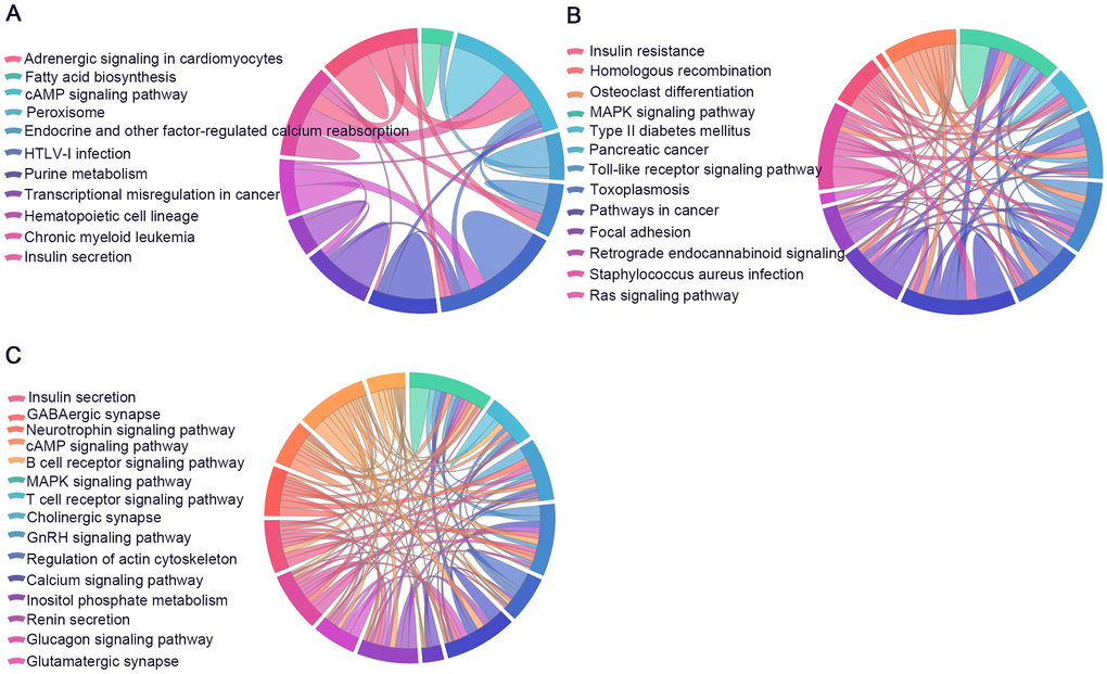 KEGG pathway analysis was conducted to determine the signaling cascades related to the identified genes. By using p < 0.05 as the threshold value, a number of significantly enriched pathways were identified (Figure 9, Supplementary Tables 12–14), including neuroactive ligand-receptor interaction, AMP-activated protein kinase (AMPK) signaling, long-term potentiation, Hippo signaling, glutamatergic synapse, PI3K-Akt signaling, insulin secretion, focal adhesion and axon guidance.