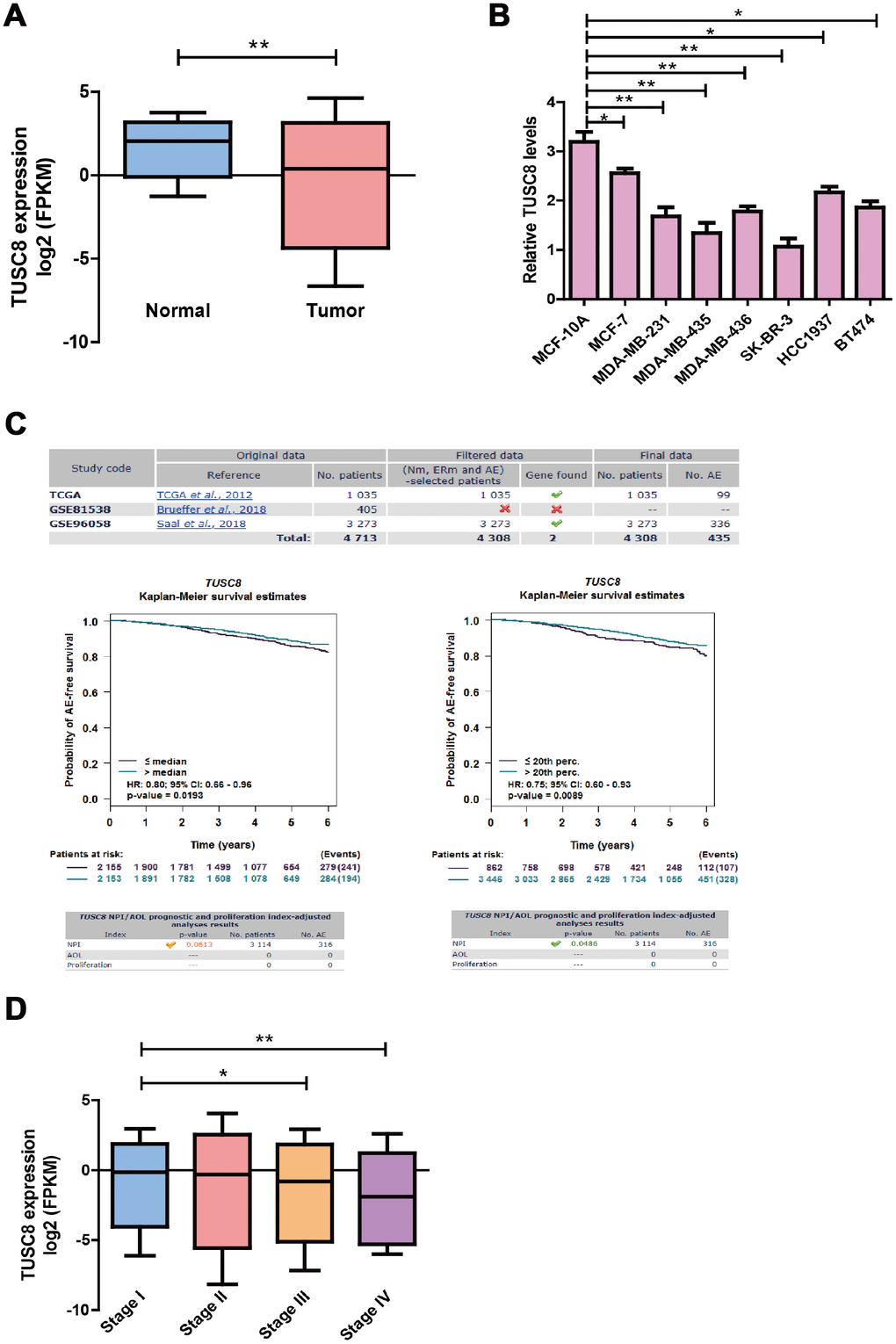 To identify the expression pattern of TUSC8 in breast cancer progression, we observed the significant down-regulation of TUSC8 expression in breast cancer samples (n=1104) compared with adjacent normal breast tissues (n=113) in TCGA database (p < 0.01) (Figure 1A). For the TUSC8 expression levels in breast cancer cell lines, the data indicated that TUSC8 expressions were significantly down-regulated in multiple breast cancer cell lines compared with normal breast cancer cell line MCF-10A by RT-PCR assay (p < 0.05, p < 0.01 respectively) (Figure 1B). Moreover, for the overall survival and prognosis value of TUSC8 in breast cancer patients, the curve demonstrated that the high expression of TUSC8 showed better overall survival of breast cancer patients compared with low expression group in TCGA database and GSE dataset (Figure 1C). Additionally, for the expression levels of TUSC8 in different stages of breast cancer patients in TCGA cohort, the results suggested that TUSC8 expression reduced gradually from stage I to stage IV (p < 0.05, p < 0.01 respectively) (Figure 1D), indicating that TUSC8 was associated with breast cancer progression.