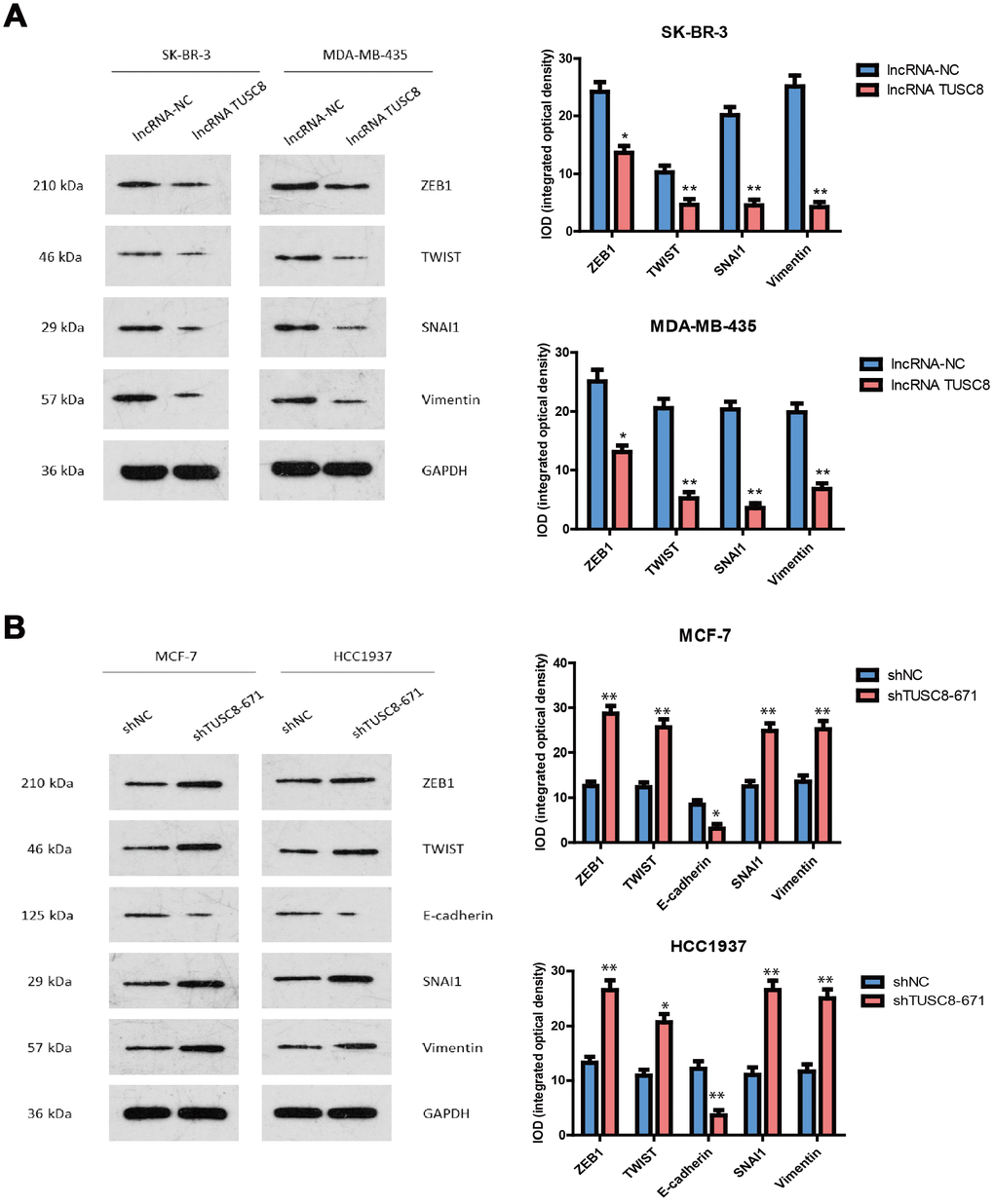 The epithelial-mesenchymal transition (EMT) is a reversible process by which a polarized epithelial cell is transformed into a cell with a mesenchymal phenotype and a conserved cellular program that alters cell shape, adhesion and movement [26]. The shift to mesenchymal-like phenotype can promote tumor cell intravasation of surrounding blood vessels and migration to new organs [27]. In addition to motility, EMT is associated with enhanced stem cell properties and drug resistance, thus it can drive metastasis, tumor recurrence, and therapy resistance in the context of different cancers [28]. Numerous studies have already emphasized the crucial roles of lncRNAs in the EMT process of cancer development. LncRNA PTAR was reported to promote EMT and metastasis in serous ovarian cancer by competitively binding miR-101-3p to regulate ZEB1 expression [29]. LncRNA FEZF1-AS1 enhanced EMT through suppressing E-cadherin and regulating Wnt/beta-catenin signaling in non-small cell lung cancer (NSCLC). Moreover, down-regulation of lncRNA FEZF1-AS1 suppressed cell EMT process by increasing the expression of E-cadherin and ZO-1, whereas, decreasing the expression of Slug, Twist and Vimentin in NSCLC cells [30]. In this research, we demonstrated that knock-down of TUSC8 facilitated EMT process through up-regulating the expression of mesenchymal related markers (ZEB1, Twist, SNAI1 and Vimentin), while down-regulating the expression of epithelial related marker (E-cadherin) in breast cancer cell and mice models, thus contributing to the metastasis of breast cancer.