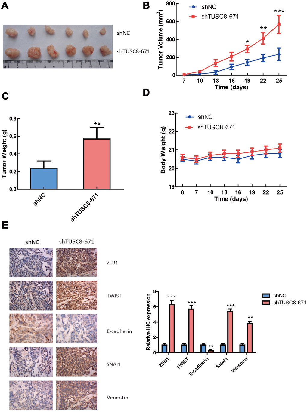 To further validate the functional role of TUSC8 in vivo, we adopted a xenograft mouse model through subcutaneously injecting negative control (NC) and TUSC8 knockdown MCF-7 cells into nude mice. The results showed that tumors grown from TUSC8 stable knockdown MCF-7 cells were much bigger and had larger tumor volumes than tumors grown from control cells (p < 0.05, p < 0.01, p < 0.001 respectively) (Figure 4A, 4B). The average tumor weight in the shTUSC8 group was also much higher than that in the control group (p < 0.01) (Figure 4C). However, the body weight of nude mice exhibited no significant difference between the TUSC8 knockdown group and the control group (Figure 4D). Furthermore, the IHC staining of EMT related markers in tumor tissues indicated that the expression of mesenchymal markers (including ZEB1, TWIST, SNAI1 and Vimentin) were significantly up-regulated and the epithelial marker E-cadherin expression was down-regulated in TUSC8 knockdown group compared with the control group (p < 0.01, p < 0.001 respectively) (Figure 4E).