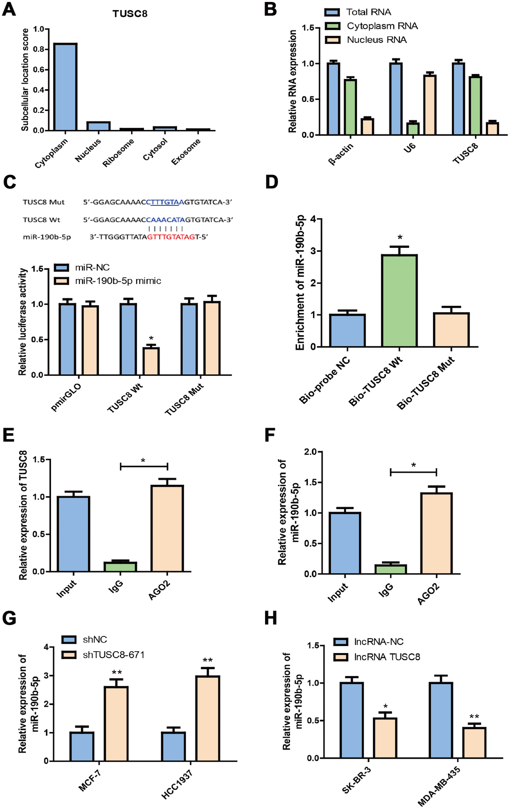 To further confirm the direct association between TUSC8 and miR-190b-5p, the RNA pull-down assay and AGO2-RIP assay were carried out. The data of RNA pull-down assay showed that compared with the treatment of Bio-probe NC, the treatment of Bio-TUSC8 Wt significantly increased enrichment of miR-190b-5p (p < 0.05), while no significant change was found in enrichment of miR-190b-5p following the treatment of Bio-TUSC8 Mut (Figure 5D). Moreover, since AGO2 is a critical component of the RNA-induced silencing complex (RISC) and acts as a critical modulator for miRNA post-transcriptional repression, AGO2-RIP assay was performed in SK-BR-3 cell lysates, followed by RT-PCR to detect TUSC8 and miR-190b-5p association with AGO2. The results suggested that endogenous TUSC8 pull-down by AGO2 was significantly enriched in SK-BR-3 cells (p < 0.05), indicating that TUSC8, miR-190b-5p and AGO2 formed in the same RISC complex (Figure 5E, 5F). Additionally, knock-down of TUSC8 significantly elevated the miR-190b-5p expression level in MCF-7 and HCC1937 cell lines (p < 0.01) (Figure 5G), whereas over-expression of TUSC8 drastically reduced the miR-190b-5p expression level in SK-BR-3 and MDA-MB-435 cell lines (p < 0.05, p < 0.01 respectively) (Figure 5H). Together, these data demonstrated that TUSC8 could physically bind with miR-190b-5p and competitively sponge miR-190b-5p as a ceRNA to regulate its steady state.