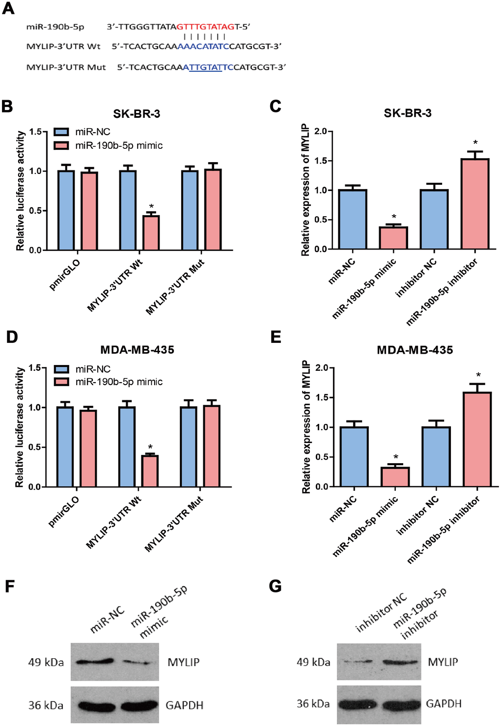 By using different bioinformatics tools (including TargetScan, PicTar, PITA, miRanada and starBase v3.0) to predict the putative downstream targets of miR-190b-5p, we found the candidate target MYLIP overlapped in these databases containing the complementary binding sites for the seed region of miR- 190b-5p (Figure 6A). Then, we constructed the MYLIP 3′-UTR Wt (wild type) and Mut (mutant) vectors according to their binding sites with miR-190b-5p seed sequences (highlighted in red) (Figure 6A), and co-transfected them with miR-190b-5p mimic or mimic control in SK-BR-3 and MDA-MB-435 cells for dual luciferase reporter assay. The data hinted that miR-190b-5p over-expression markedly decreased the relative luciferase activity in MYLIP 3’-UTR Wt group rather than MYLIP 3’-UTR Mut group (p < 0.05) (Figure 6B, 6D), which suggested that miR-190b-5p could directly regulate the expression of MYLIP through targeting its 3’-UTR region. Next, we detected the mRNA and protein expression levels of MYLIP in SK-BR-3 and MDA-MB-435 cell lines after transfected with miR-190b-5p mimic, miR-190b-5p inhibitor and their negative controls. The results demonstrated that over-expression of miR-190b-5p could significantly down-regulate the MYLIP mRNA and protein expression levels (p < 0.05) (Figure 6C, 6E, 6F). Conversely, inhibition of miR-190b-5p expression could significantly up-regulate the MYLIP mRNA and protein expression levels (p < 0.05) (Figure 6C, 6E, 6G). All of the above data indicated that MYLIP was a direct downstream target of miR-190b-5p in breast cancer cells.