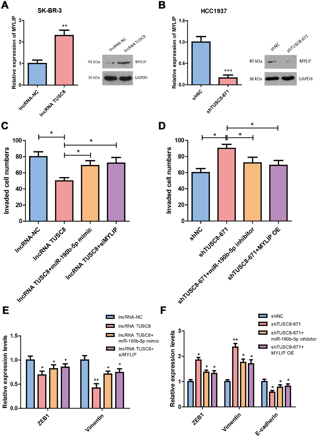 We then explored whether TUSC8 regulates breast cancer metastasis via miR-190b-5p-MYLIP axis. Using RT-PCR assay and western blot, we confirmed that over-expression of TUSC8 significantly increased the mRNA and protein levels of MYLIP in SK-BR-3 cells (p < 0.01) (Figure 7A), and knock-down of TUSC8 drastically suppressed the mRNA and protein levels of MYLIP in HCC1937 cells (p < 0.001) (Figure 7B). These data suggested that MYLIP expression was positively correlated with TUSC8 expression in breast cancer. Additionally, over-expression of TUSC8 reduced the cell invasive capacities and affected EMT related markers expression (down-regulation of ZEB1 and Vimentin) in SK-BR-3 cells. Ectopic expression of miR-190b-5p or MYLIP inhibition partly abolished these effects (p < 0.05, p < 0.01 respectively) (Figure 7C, 7E). Inversely, knock-down of TUSC8 enhanced the cell invasive capacities and affected EMT related markers expression (up-regulation of ZEB1/Vimentin, and down-regulation of E-cadherin) in HCC1937 cells, which were partially rescued by inhibition of miR-190b-5p or MYLIP over-expression (p < 0.05, p < 0.01 respectively) (Figure 7D, 7F).