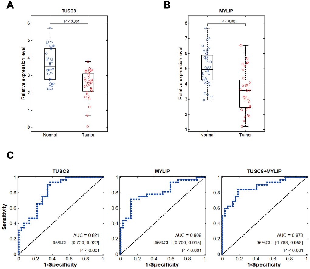 Using RT-PCR assay in tumorous and adjacent normal breast tissues in 32 cases of breast cancer patients, we identified that TUSC8 and MYLIP were significantly down-regulated in breast cancer (p < 0.001) (Figure 8A, 8B). In the following step, we verified TUSC8 down-regulation in an expanded breast cancer sample cohort and conducted the clinicopathological correlation analysis using median cut-off method. The results revealed that low expression of TUSC8 was significantly associated with aggressive tumor behavior in large tumor size (p=0.0009), tumor encapsulation (p=0.005), venous invasion (p=0.002) and advanced TNM staging (p=0.002) of breast cancer patients (Table 1). In order to further evaluate the diagnostic values of TUSC8 and MYLIP in breast cancer, we used the receiver operating characteristic curve (ROC) analyses to assess the potential use of these two biomarkers for differentiation of breast cancer patients. As depicted in Figure 8C, the area under the curve (AUC) of TUSC8 for the diagnosis was 0.821 with a 95% confidence interval (CI) of 0.720-0.922 (p < 0.001), the AUC of MYLIP for the diagnosis was 0.808 with a 95% CI of 0.700-0.915 (p < 0.001), and the AUC of TUSC8+MYLIP for the diagnosis was 0.873 with a 95% CI of 0.788-0.958 (p < 0.001). These results hinted that the combination usage of TUSC8 and MYLIP might serve as promising diagnostic biomarkers for breast cancer.