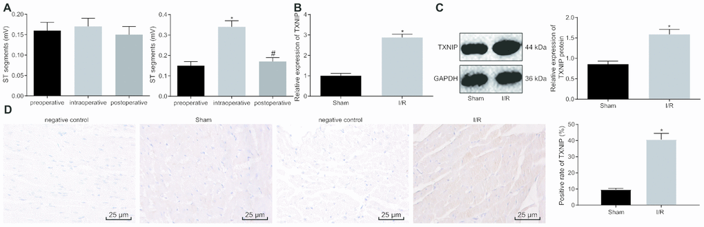 First, rat models of I/R were induced for exploration purpose in vivo. Results revealed no significant differences regarding preoperative, intraoperative and postoperative ST segment of ECG in sham-operated rats. Rats with I/R exhibited a significantly higher ST segment after ligation than before, which was reduced after reperfusion, indicating that the conduction of vessel occlusion exerted no obvious effects on cardiac electrophysiology of rats. Significant difference in ST segment was observed after ligation of LAD in comparison to ST segment during ligation. Following reperfusion, cardiac electrophysiology was recovered, suggesting the successful establishment of the I/R rat model (Figure 1A and Supplementary Figure 1). All procedures were performed on surviving rats without malignant arrhythmia. The survival rate of sham-operated rats was 100% while that of I/R-induced rats was 94.44% on the 28th day post modeling. Meanwhile, to investigate the effects of TXNIP on myocardial injury of rats with I/R, the expression profile of TXNIP was determined in the myocardium on the ischemic border area. As shown in Figure 1B, 1C, TXNIP expression significantly increased in rats with I/R compared to sham-operated rats (p < 0.05). The immunohistochemistry results further confirmed that positive expression of TXNIP in the cytoplasm was significantly higher in rats with I/R that in sham-operated rats (Figure 1D). The aforementioned findings demonstrate that TXNIP is highly expressed in rats with I/R.