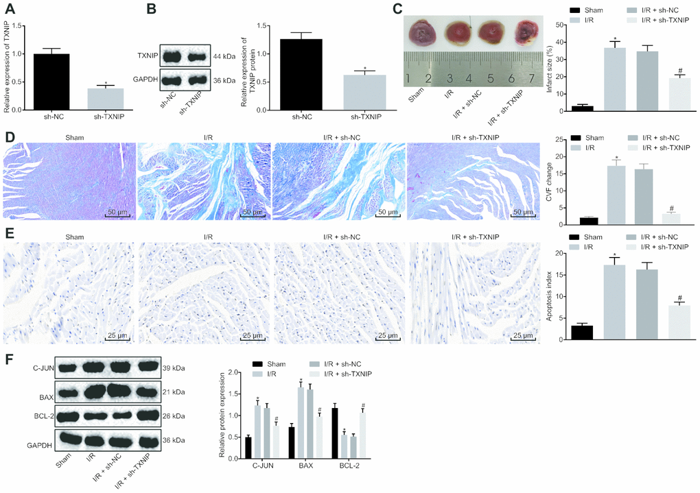 Given the elevated expression of TXNIP, TXNIP was knocked down to investigate its role in I/R injury. The knockdown efficiency of TXNIP was assessed by Reverse transcription quantitative polymerase chain reaction (RT-qPCR) and Western blot analysis. Figure 2A, 2B revealed that mRNA and protein expression of TXNIP significantly declined after knockdown. Assessment of cardiac functions (Table 1) revealed that rats with I/R had significantly higher levels of LVEDV, LVEDD, LVESV and LVESD along with lower levels of LVEEF and LVEFS. Opposite changing tendency was detected in I/R rats with TXNIP knockdown when compared with I/R rats with sh-NC. Subsequently, TTC and Masson's staining assays were used to evaluate MIS and CVF, respectively, both of which increased in I/R rats and decreased in the presence of TXNIP knockdown (Figure 2C, 2D). TUNEL staining was then performed to detect cardiomyocyte apoptosis, followed by Western blot analysis for quantification of apoptosis-related factors (c-Jun, Bax and Bcl-2). It was found that, cardiomyocyte apoptosis was promoted in I/R rats accompanied by higher levels of c-Jun and Bax along with lower Bcl-2 level but suppressed following treatment of TXNIP knockdown in parallel with lower levels of c-Jun and Bax along with higher Bcl-2 level (Figure 2E, 2F). These findings indicate that myocardial remodeling in rats with I/R can be impeded by TXNIP knockdown.