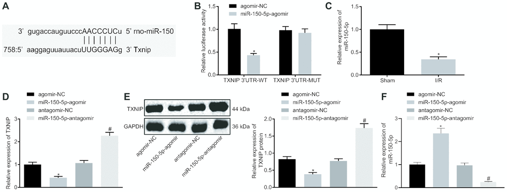 Prediction software at microrna.org identified binding sites between miR-150-5p and TXNIP (Figure 3A). The binding between them was confirmed using the dual-luciferase reporter gene assay. The luciferase activity of TXNIP 3’UTR-WT was significantly inhibited by miR-150-5p-agomir but that of TXNIP 3’UTR-MUT remained almost unchanged (Figure 3B). RT-qPCR revealed that miR-150-5p expression was significantly lower in I/R rats than sham-operated rats (Figure 3C). Next, miR-150-5p in neonatal cardiomyocytes was overexpressed and inhibited to figure out the relation between miR-150-5p and TXNIP by means of RT-qPCR and Western blot analysis. Results showed that mRNA and protein expression of TXNIP remarkable decreased following miR-150-5p overexpression but increased following miR-150-5p inhibition (Figure 3D, 3E). Besides, miR-150-5p expression increased in response to delivery of miR-150-5p-agomir and decreased in response to delivery of miR-150-5p-antagomir (Figure 3F). Taken together, miR-150-5p targets TXNIP and negatively regulates its expression.
