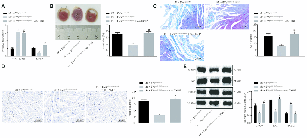 Next, we explored the mechanism by which miR-150-5p and TXNIP regulate myocardial remodeling after I/R injury. RT-qPCR was used to detect the transduction efficiency of I/R rats with results shown in Figure 5A, signaling the initiation of following analysis. Cardiac function assessment (Table 1) demonstrated that LVEDV, LVEDD, LVESV and LVESD were significantly decreased while LVEEF and LVEFS were increased in I/R rats following treatment of EVmiR-150-5p-agomir. However, the addition of oe-TXNIP rescued the effects induced by EVmiR-150-5p-agomir. TTC and Masson's staining assays showed that oe-TXNIP also reversed the inhibitory effects of EVmiR-150-5p-agomir on MIS and CVF (Figure 5B, 5C). As for cardiomyocyte apoptosis detection using TUNEL staining and Western blot analysis, EVmiR-150-5p-agomir treatment lowered the apoptosis rate and decreased c-Jun and Bax protein levels while it increased Bcl-2 protein level. Expectedly, such alternations could be rescued by oe-TXNIP (Figure 5D, 5E). The above-mentioned results suggest that EVs-loaded miR-150-5p regulates TXNIP to further inhibit myocardial remodeling after I/R.