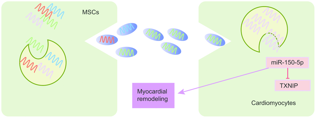 Extracellular vesicles (EVs) are lipid vesicles outside cells carrying functional RNAs and proteins to other cells [10]. EVs have been reported to play important roles in immune system and tumor progression [11, 12]. The first report to suggest a role for EVs in myocardial I/R injury was published in 2010. Lai et al. showed that EVs from mesenchymal stem cells (MSCs) could significantly reduce the damages caused by myocardial I/R injury [13]. The mechanism that MSCs-derived EVs ameliorated myocardial I/R injury conditions was partly uncovered three years later which was associated with the PI3K/Akt signaling pathway [14]. EVs are known to transfer microRNAs (miRNAs) from one cell to another as a means of communication. miRNAs, endogenously produced in eukaryotic cells, induce gene-specific silencing by elevated degradation or translational inhibition of mRNA through incomplete complementary sequence binding [15, 16]. Most miRNAs are intergenic, and located in noncoding regions between genes and transcribed by unidentified promoters [17]. How miRNAs carried by EVs regulate TXNIP and further affect myocardial I/R injury damage is less studied. Therefore, in the present study, we reported miR-150-5p carried by MSCs-derived EVs reduced myocardial remodeling in a rat model with I/R, providing a promising treatment of myocardial I/R injury via delivery of EVs secreted from MSCs.