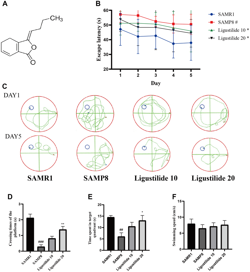 In this study, we employed an aging-related model, SAMP8 (senescence-accelerated mouse prone 8) [13], to explore whether ligustilide could improve cognitive dysfunction. SAMP8 is mainly characterized by age-related accelerated decline in learning and memory, and pathological changes in the central nervous system. Because of its early and natural occurrence of learning and memory impairment, SAMP8 is an excellent model for the formation of learning and memory impairment related to human aging. It is currently an ideal model for studying aging-related cognitive impairment [14]. Moreover, mice of the same progenitor strain but with normal aging process, SAMR1 (senescence accelerated mouse resistant) [15], can be usually used as an internal control when studying SAMP mice.