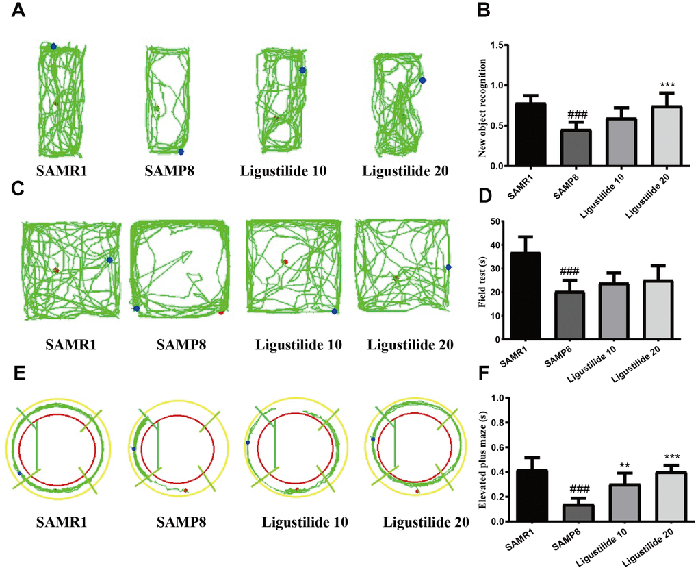 SAMP8 mice were randomly divided into 3 groups (n = 20), model group, ligustilide low-dose (10 mg/kg, in 3% Tween-80)), and high-dose (20 mg/kg, in 3% Tween-80). From the age of 8 months, the mice were treated daily with ligustilide. The treatments were administered once a day for 8 consecutive weeks. All drugs were administered by oral administration. Behavioral testing was started after 8 weeks.