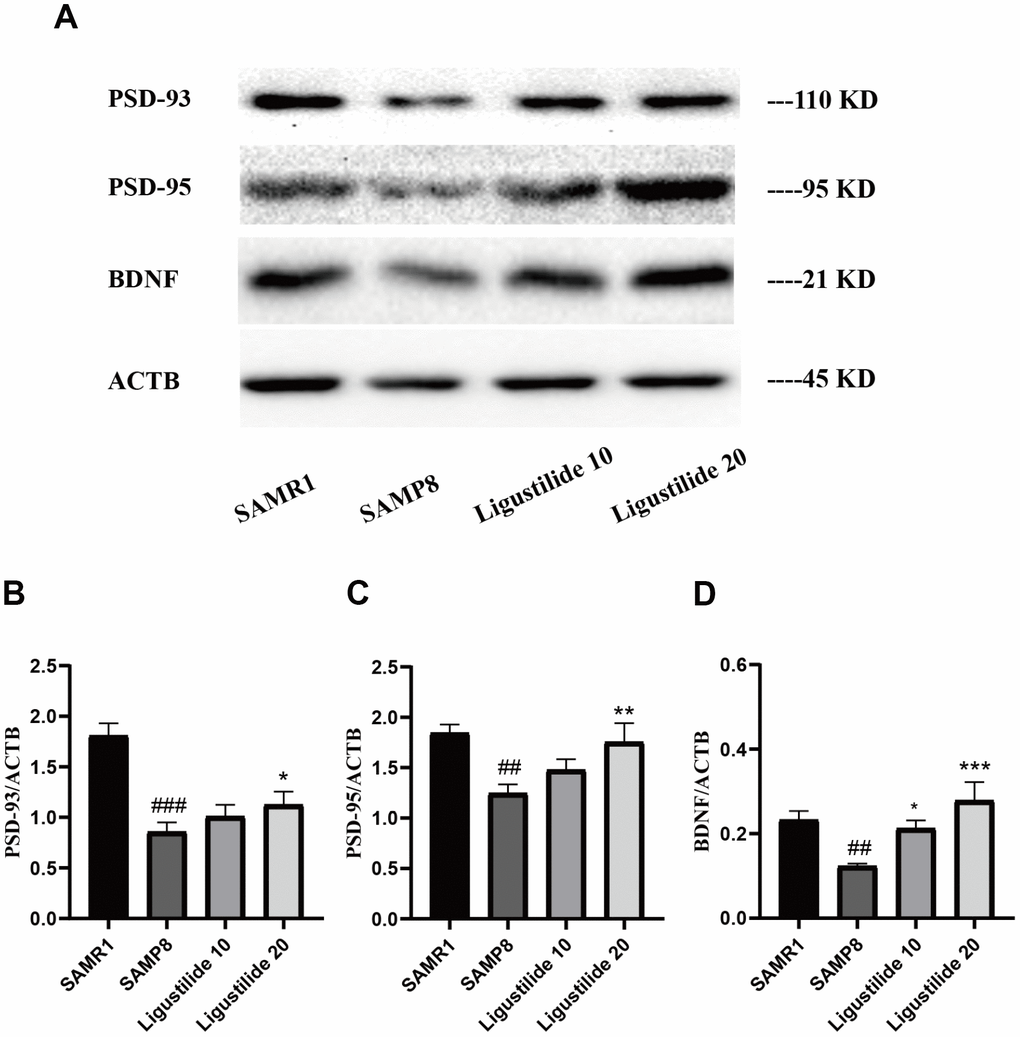 As shown in Figure 3, the protein expressions of neuron-related factors, such as PSD95, PSD93 and BDNF in SAMP8 were significantly decreased. While after the treatment of ligustilide, the proteins of the high-dose group elevated to the normal level, the proteins of the low-dose group were slightly below normal. These changes indicated that ligustilide could ameliorate aging-related neurodegeneration in SAMP8 mice.