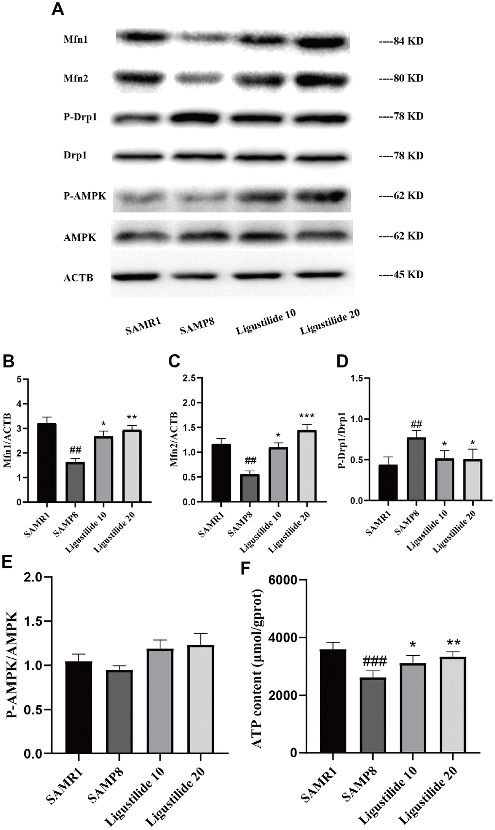 Mitochondrial dysfunction is often occurred in the aging-related disease. As shown in Figure 4, the protein expression of P-Drp1 was sharply increased, while Mfn1 and Mfn2 were decreased in SAMP8. After Ligustilide treatment, the levels of Mfn1 and Mfn2 increased and P-Drp1 decreased. Ligustilide treatment relieved the fusion and fission dysregulation of mitochondria in SAMP8. Ligustilide treatment also increased the protein level of P-AMPK and the content of ATP in SAMP8 mice.
