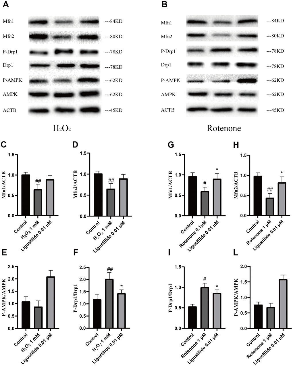 To determine whether ligustilide improves mitochondrial dysfunction, we employed two cell models, H2O2-exposed and Rotenone-exposed HT22 cells, to study. The H2O2 and rotenone treatment significantly reduced the intracellular Mfn1, Mfn2, and P-AMPK levels in HT22 cells, while a strongly increase in ligustilide pretreatment in HT22 cells exposed to H2O2 and rotenone (Figure 5A and 5B). In addition, as shown in Figure 5A and 5B, the intracellular level of P-Drp1, which are a major factor of maintaining mitochondrial dynamic balance, was greatly ameliorated by the pretreatment with ligustilide compared to the H2O2 only group. In conclusion, these results were consistent with in vivo data, suggesting that ligustilide pretreatment protects HT22 cells by increasing the levels of Mfn1, Mfn2, and P-AMPK and down-regulating the levels of P-Drp1.