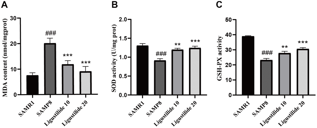 There is increasing evidence that neuronal loss, mitochondrial mitigation and mitochondrial dysfunction occur during AD, leading to the progressive cognitive decline in AD, which may be associated with increased oxidative damage. Excessive oxidative stress can not only directly destroy cell membranes, RNA and protein, but also promote neuroinflammation and neuronal apoptosis [33]. Mitochondria are thought to be an important part of the production of reactive oxygen species in cells [34]. Oxygen is consumed in the mitochondria. When mitochondria are damaged, the body’s oxidative stress response is activated, which in turn causes apoptosis and inflammation, and the cells appear dysfunctional [35]. In this study, we find elevated levels of MDA and a decrease in GSH level and the activity of SOD in the SAMP8 mice under the treatment of ligustilide. Elevated oxidative stress was occurred in SAMP8 mice. Ligustilide effectively relieved this changes.