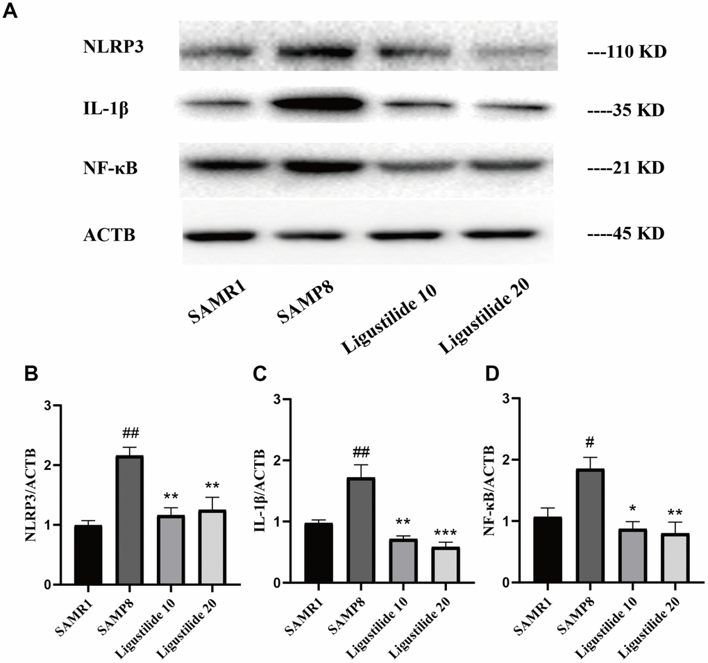 As shown in Figure 6, the lipid peroxidation product MDA, a marker of oxidative stress, was increased in SAMP8 mice. Ligustilide significantly reduced the level of MDA. The anti-oxidative enzymes, SOD and GSH-PX, were also detected. Ligustilide increased the activity of SOD and GSH-PX. As shown in Figure 7, the level of neuroinflammation (NLRP3, IL-1β and NF-κB) was increased in SAMP8 mice. After ligustilide treatment, these proteins were decreased almost to normal level. These results indicated that ligustilide could confrontation AD-like neuropathology in SAMP8 mice.