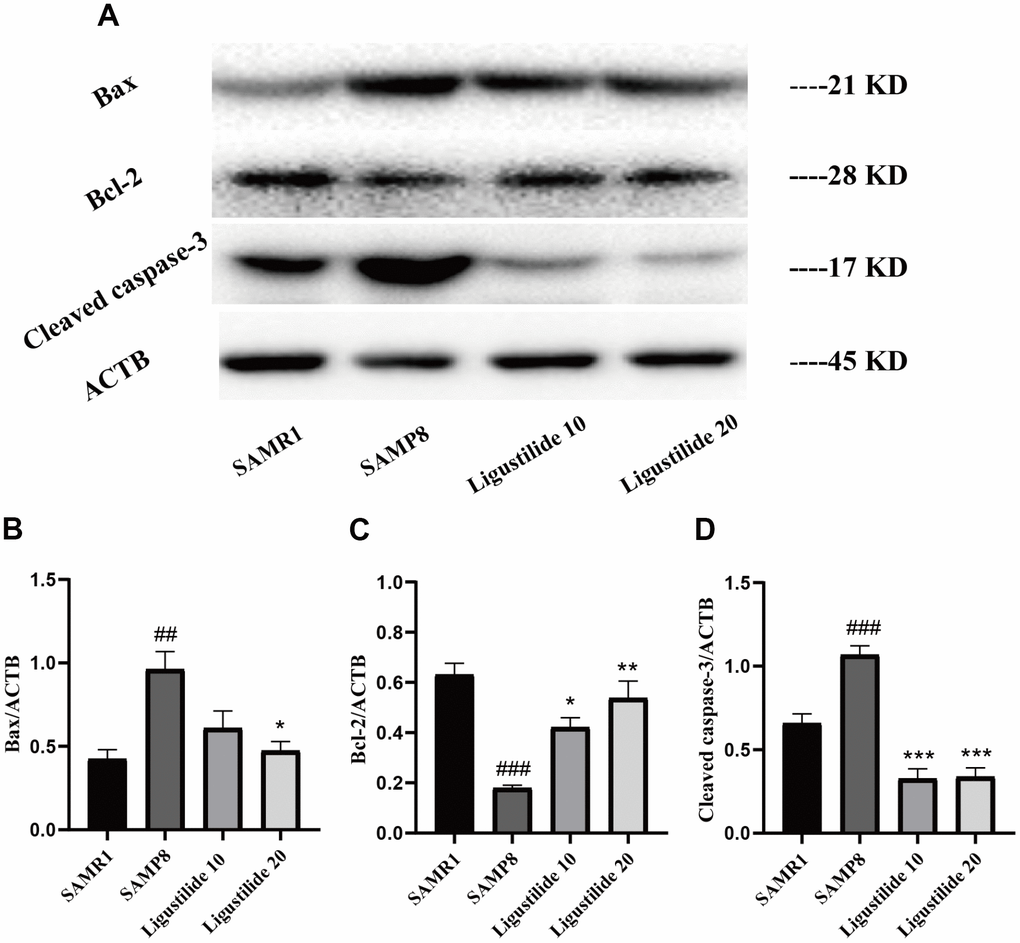 The expression of apoptotic markers, Bax, Bcl-2 and caspase-3, was detected to assess the apoptotic processes that occurred in all groups of tissues. As shown in Figure 8, the expression of apoptosis-related proteins Bax and cleaved Caspase-3 increased and Bcl-2 decreased in SAMP8. Ligustilide increased the Bcl-2 expression and decreased the Bax and cleaved Caspase-3 expressions.