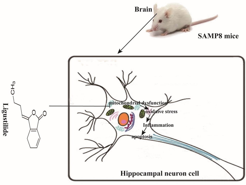 In this study, we demonstrate that ligustilide is capable of mitigating age-associated cognitive decline in SAMP8 mice. An eight-week-administration of ligustilide protected the learning and memory, improved mitochondrial dysfunction, reduced inflammation and apoptosis (Figure 9).