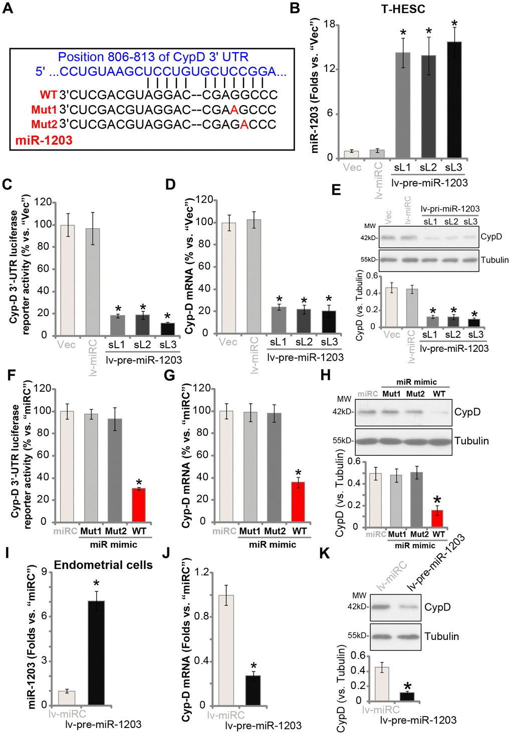 The results above indicated that miR-1203 selectively targets and silences CypD in T-HESC cells. To further support our hypothesis, T-HESC cells were transfected with either wild type (“WT-”) or two mutant (“Mut1/2”) miR-1203 mimics (Figure 1A). The mutants contain nucleotide mutations at the miR-1203’s binding sites to Cyp-D 3′-UTR (Figure 1A). As shown, only the WT miR-1203 mimic induced downregulation of the Cyp-D 3′-UTR luciferase reporter activity (Figure 1F) and CypD mRNA/protein expression (Figure 1G and 1H). While the two mutant miR-1203 mimics were completely ineffective (Figure 1F–1H). In the primary human endometrial cells, lv-pre-miR-1203 infection led to significant elevation of mature miR-1203 expression (Figure 1I), resulting in reductions in CypD mRNA (Figure 1J) and protein (Figure 1K) expression. The microRNA control (“miRC”) had no significant effect on miR-1203 and CypD expression in human endometrial cells (Figure 1B–1K). Collectively, these results show that miR-1203 targets and silences CypD in human endometrial cells.
