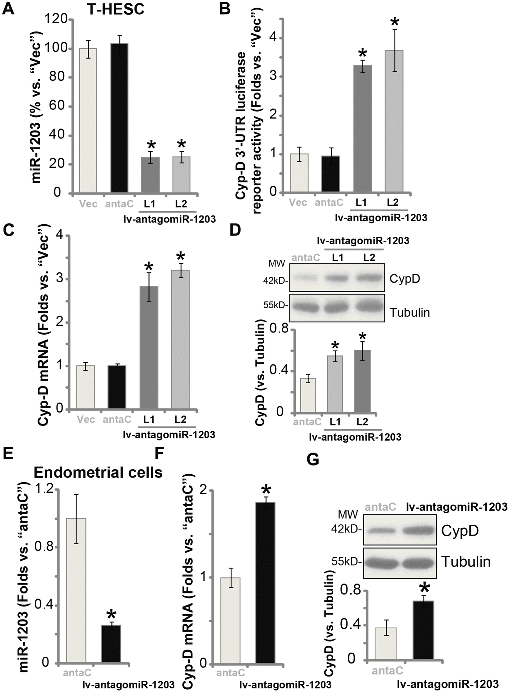 Results in Figure 1 show that miR-1203 targets and silences CypD, therefore miR-1203 inhibition could lead to CypD elevation in human endometrial cells. T-HESC cells were then infected with the lentivirus encoding the anti-sense of pre-miR-1203 (“lv-antagomiR-1203”). Puromycin was added again to establish the two stable cell lines, “L1/L2”. qPCR results, Figure 2A, show that the mature miR-1203 levels decreased over 70% in the lv-antagomiR-1203-expressing stable T-HESC cells. As a result, the Cyp-D 3′-UTR luciferase reporter activity was significantly increased (3-4 folds of control cells, Figure 2B). In T-HESC cells miR-1203 inhibition by lv-antagomiR-1203 boosted CypD mRNA (Figure 2C) and protein (Figure 2D) expression. Notably, the microRNA anti-sense control sequence (“antaC”) was ineffective on expression of miR-1203 (Figure 2A) and CypD (Figure 2C and 2D). In the primary human endometrial cells, lv-antagomiR-1203 infection similarly resulted in reduced expression of miR-1203 (Figure 2E), leading to increased CypD mRNA (Figure 2F) and protein (Figure 2G) expression (vs. antaC control cells). Collectively, these results show that forced miR-1203 inhibition elevated CypD expression in human endometrial cells.