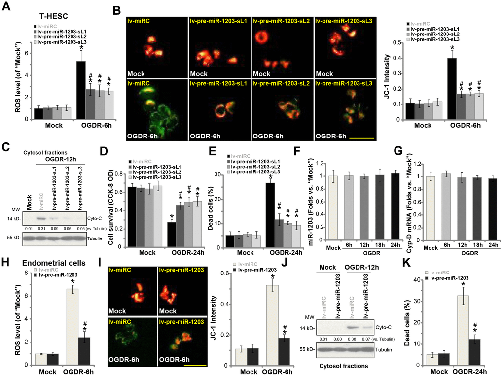 Our previous studies have demonstrated that OGDR mainly induced programmed necrosis in endometrial cells [14, 15], leading to mitochondrial CypD-p53-ANT1 association, mitochondrial depolarization, ROS production, and medium LDH release [14, 15], and eventually causing cell necrosis (but not apoptosis). On the contrary, CypD silencing or inhibition largely attenuated OGDR-induced endometrial cell necrosis [14, 15]. Since miR-1203 targets and silences CypD in human endometrial cells, we tested its activity on OGDR-induced cytotoxicity in human endometrial cells. As shown, in control T-HESC cells, OGDR stimulation induced significant ROS production (H2DCF-DA fluorescence intensity increase, Figure 3A), which was largely inhibited in the stable lines with ectopic miR-1203 overexpression (lv-pre-miR-1203-sL1/2/3, Figure 3A). Furthermore, experimental miR-1203 overexpression potently inhibited OGDR-induced mitochondrial depolarization, evidenced by JC-1 green fluorescence accumulation (Figure 3B). Additionally, the cytochrome C release to cytosol by OGDR was significantly attenuated by forced miR-1203 overexpression as well (Figure 3C). Consequently, OGDR-induced viability (CCK-8 OD) reduction (Figure 3D) and cell necrosis (medium LDH release, Figure 3E) were largely suppressed in lv-pre-miR-1203-expressing cells. These results suggest that ectopic overexpression of miR-1203 attenuated OGDR-induced programmed necrosis in T-HESC endometrial cells. Notably, the ROS scavenger N-acetylcysteine (NAC) largely ameliorated OGDR-induced cell viability reduction (Supplementary Figure 1A) and necrosis (medium LDH release, Supplementary Figure 1B) in T-HESC endometrial cells. Interestingly, OGDR treatment by itself failed to significantly change miR-1203 (Figure 3F) and CypD (Figure 3G) expression in T-HESC endometrial cells.