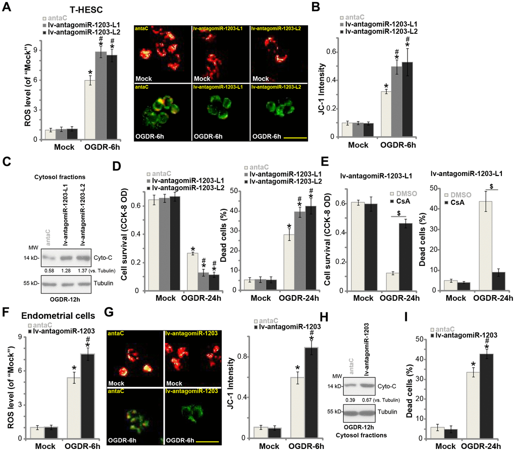 Based on the results in Figure 3, we hypothesized that experimental miR-1203 inhibition could possibly intensify OGDR-induced cytotoxicity in human endometrial cells, as it resulted in CypD upregulation (see Figure 2). The stable T-HESC cells with lv-antagomiR-1203 (see Figure 2) were subjected to OGDR procedure. As shown, as compared to control cells with anta-C (see Figure 2), lv-antagomiR-1203-expressing T-HESC cells showed increased ROS production (Figure 4A). OGDR-induced mitochondrial depolarization, or JC-1 green fluorescence accumulation, was intensified with forced miR-1203 inhibition (Figure 4B). Furthermore, after miR-1203 inhibition, cytosol cytochrome c release was significantly augmented (Figure 4C). The lv-antagomiR-1203-expressing T-HESC cells were more vulnerable to OGDR, presented with enhanced cell viability reduction (Figure 4D, the left panel) and necrosis (LDH assay, Figure 4D, the right panel), when compared to the control cells. Additional experimental results show that OGDR-induced profound cytotoxicity and necrosis in lv-antagomiR-1203-expressing T-HESC cells (“L1”) were largely attenuated by CsA, the CypD blocker [21, 22] (Figure 4E). These results indicate that forced miR-1203 inhibition induced CypD elevation, therefore aggravating OGDR’s cytotoxicity in endometrial cells.