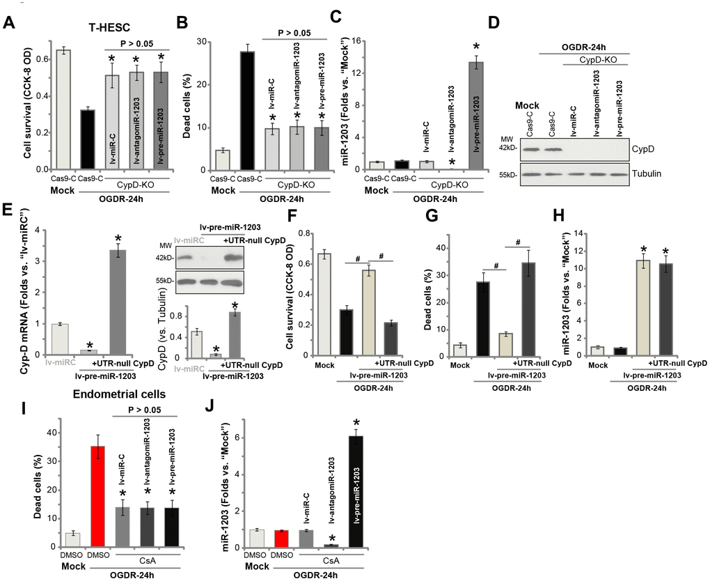 To further support our hypothesis, an UTR-depleted CypD construct (“UTR-null CypD”) was transduced to miR-1203-overexpressed T-HESC endometrial cells, that completely restored CypD mRNA and protein expression (Figure 5E). Importantly lv-pre-miR-1203-induced T-HESC cell protection against OGDR was reversed with re-expression of the UTR-null CypD (Figure 5F and 5G). Therefore, ectopic overexpression of miR-1203 was unable to protect T-HESC cells from OGDR when CypD expression was restored (Figure 5F and 5G). Re-expression of CypD, as expected, did not change miR-1203 expression by lv-pre-miR-1203 (Figure 5H). In the primary human endometrial cells, pretreatment with CypD inhibitor CsA largely attenuated OGDR-induced cell death (Figure 5I). Importantly, experimentally altering miR-1203 expression, by lv-pre-miR-1203 or lv-antagomiR-1203 (Figure 5J), failed to change OGDR-induced cytotoxicity when CypD was blocked by CsA (Figure 5I).