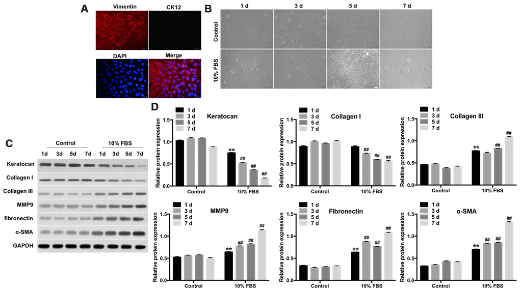 Previous studies have reported that vimentin and CK12 are specifically expressed in the keratocytes and corneal epithelium, respectively [27, 28]. Therefore, we examined the expression of stromal and epithelial markers in primary rabbit keratocytes by immunofluorescence assay. The primary rabbit keratocytes showed positive expression of vimentin, but did not express CK12 (Figure 1A). This confirmed that the rabbit corneal stroma cells were keratocytes and not epithelial cells.