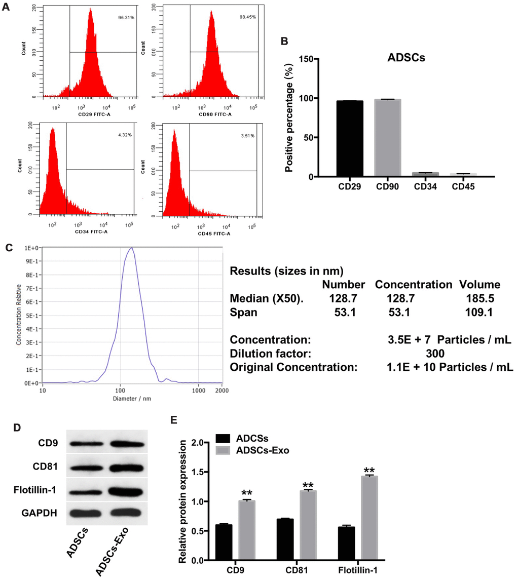 Furthermore, we analyzed the exosomes isolated from the ADSCs. Nanoparticle tracking analysis (NTA) showed that the ADSCs-Exo were approximately 100 nm in diameter with typical cup-shaped morphology (Figure 2C). Western blot analysis showed higher expression of exosomal markers, namely, CD9, CD81 and flotillin-1 in the ADSCs-Exo compared with the ADSCs (Figure 2D, 2E). These data confirmed isolation of purified ADSCs-Exo from the ADSC culture supernatants.