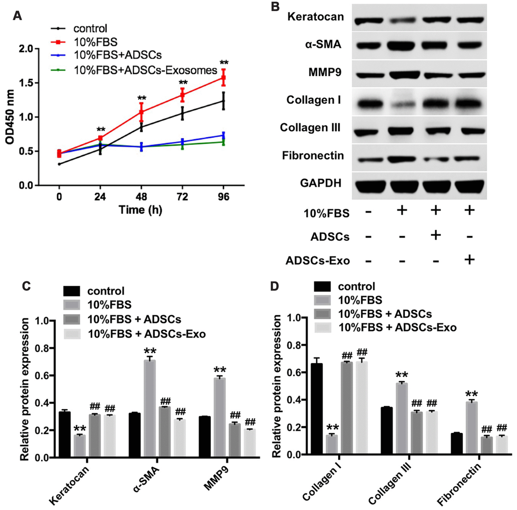 We then characterized the effects of ADSCs-Exo on the keratocytes that were grown in DMEM/F12 medium containing 10% FBS for 7 days. CCK-8 cell proliferation assay showed that 10% FBS significantly induced proliferation of corneal myofibroblasts at 24, 48, 72, and 96 h time points, whereas, FBS-induced keratocyte cell proliferation was significantly inhibited by ADSCs and ADSCs-Exo at 48, 72 and 96 h (Figure 3A). Moreover, keratocytes grown in DMEM/F12 medium containing 10% FBS showed significantly reduced keratocan and collagen I protein expression, and increased collagen III, MMP9, fibronectin and α-SMA protein levels compared with those grown in serum-free medium, but, these FBS-induced changes were inhibited when keratocytes were grown in presence of ADSCs or ADSCs-Exo (Figure 3B–3D). These data suggest that ADSCs and ADSCs-Exo inhibit differentiation of keratocytes into myofibroblasts and the proliferation of myofibroblasts.
