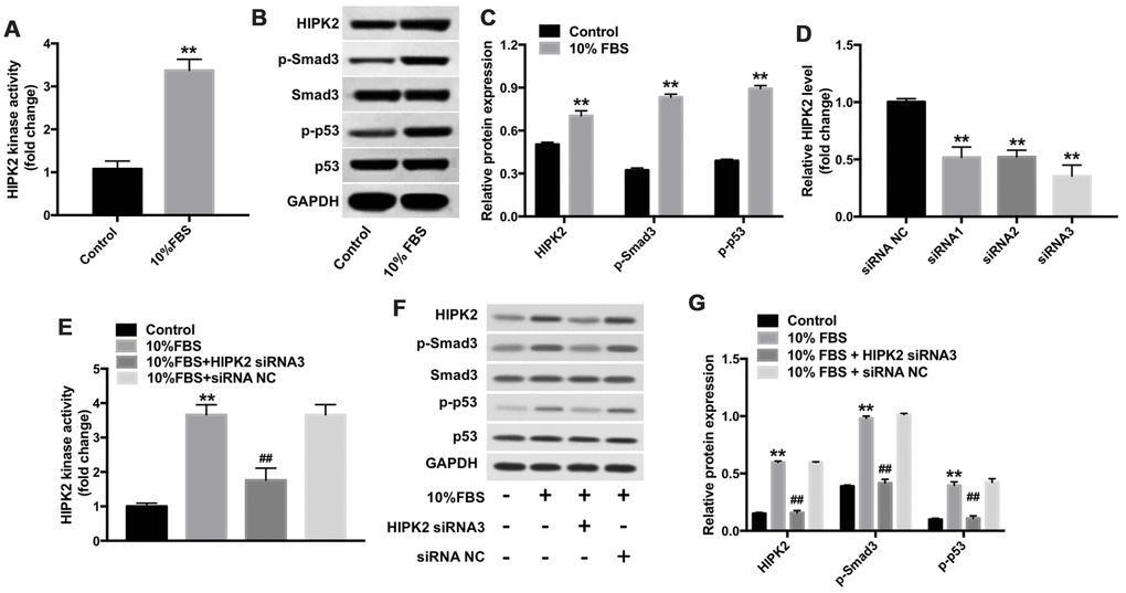 HIPK2 is a pro-fibrotic gene that modulates p53 and TGF-β/Smad3 signaling pathways [24, 25]. HIPK2 kinase activity is significantly increased in keratocytes cultured with 10% FBS for 7 days compared to controls (Figure 4A). Western blot analysis showed increased expression of HIPK2, p-Smad3 and p-p53 in keratocytes grown in medium containing 10% FBS compared with the control group (Figure 4C).