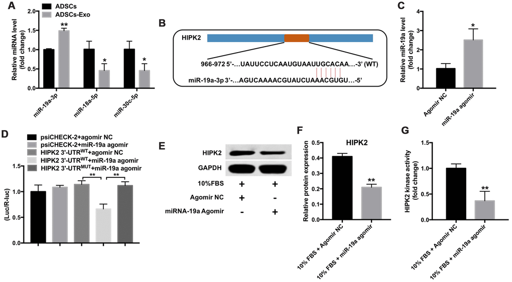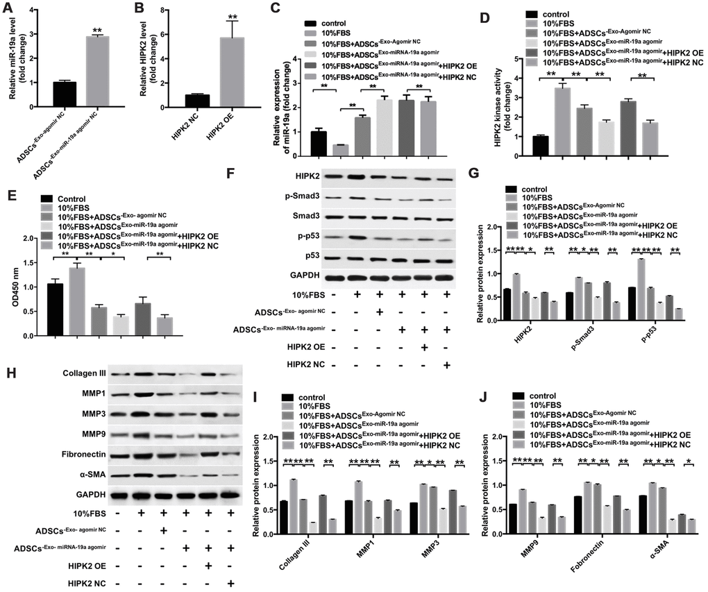 Next, we performed qRT-PCR assay to analyze if miR-19a derived from ADSCs-Exo affect differentiation of keratocytes into myofibroblasts. Keratocytes co-cultured with ADSCs-Exo showed significantly higher levels of miR-19a compared with the controls (Figure 6A). Moreover, lenti-HIPK2 transfected keratocytes showed significantly higher HIPK2 mRNA levels than the lenti-NC transfected keratocytes (Figure 6B). QRT-PCR analysis showed that miR-19a levels were significantly reduced in the keratocytes cultured with 10% FBS than the keratocytes cultured without FBS (Figure 6C). Furthermore, miR-19a levels were significantly higher in keratocytes cultured with 10% FBS and ADSCs-Exo-miR-19a-agomir compared with keratocytes cultured with 10% FBS and ADSCs-Exo-NC-agomir (Figure 6C). The HIPK2 kinase activity was significantly decreased in keratocytes cultured with 10% FBS ADSCs-Exo-miR-19a-agomir compared with keratocytes incubated with 10% FBS and ADSCs-Exo-NC-agomir, but, HIPK2 overexpression restored the HIPK2 kinase activity (Figure 6D). CCK8 assay showed that keratocytes incubated with ADSCs-Exo-miR-19a-agomir showed significantly reduced proliferation than the controls, but, HIPK2 overexpression increased the proliferation rate (Figure 6E). These data suggest that ADSCs-Exo-miR-19a inhibits proliferation of the keratocytes by targeting HIPK2.