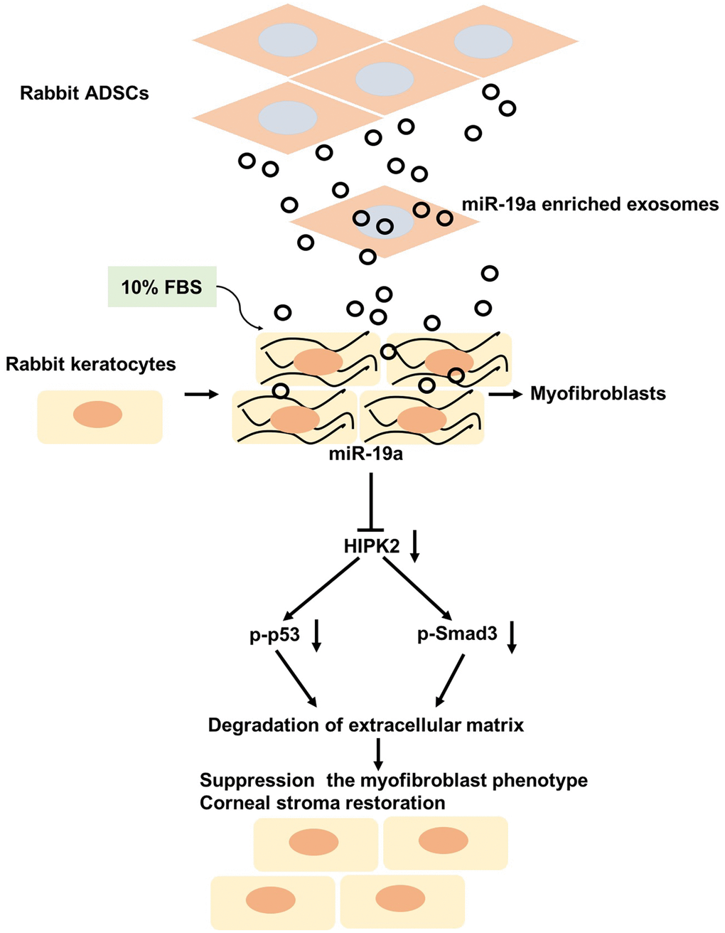 In conclusion, our study shows that ADSCs-Exo-miR-19a inhibits the differentiation of corneal keratocytes into myofibroblasts by suppressing HIPK2 expression. The downregulation of HIPK2 inhibits the TGF-β/Smad3 and p53 pathways, which results in reduced expression of pro-fibrotic markers and ECM components, thereby decreasing cell viability and ECM degradation. Therefore, our data indicates the therapeutic potential of ADSCs-Exo-miR-19a in repairing damaged corneal stromas.