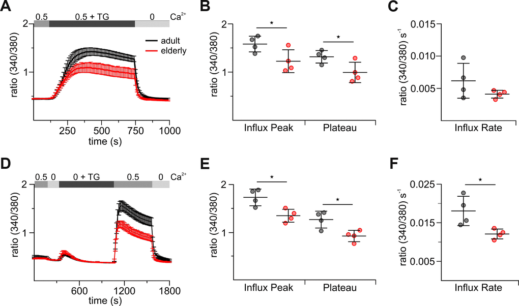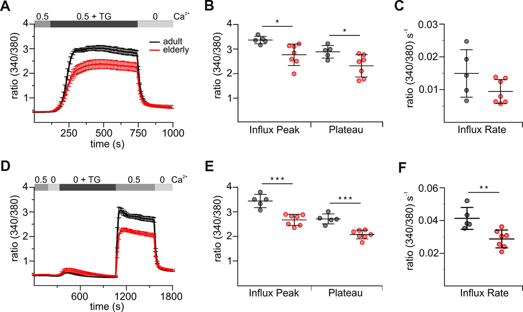Ca2+ influx is an essential step in T cell activation and regulation of diverse cellular functions and the main pathway of Ca2+ in immune cells is through STIM-gated Orai channels [5]. We first investigated store-operated Ca2+ responses of elderly and adult untouched CD8+ T cells activated by thapsigargin (TG), an irreversible inhibitor of the sarco/endoplasmic reticulum Ca2+-ATPase (SERCA) pumps. We measured Ca2+ mobilization with two different approaches. The first approach combined the measurement of Ca2+ release and entry (combined protocol, Figure 1A) in the presence of 0.5 mM [Ca2+]ext, whereas the second one separates them (Figure 1D) by carrying out the classical Ca2+ re-addition protocol. In the latter protocol, cells are initially treated with TG in Ca2+-free Ringer’s solution to deplete the endoplasmic reticulum (ER) Ca2+ stores, and Ca2+ influx is assured by subsequent addition of Ca2+. CD8+ T cells from elderly and adult mice differ in their ability to increase the internal calcium concentration ([Ca2+]int) after TG-triggered stimulation in both approaches (Figure 1A, 1D). Resting [Ca2+]int in CD8+ T cells from both mice was not significantly changed in combined and re-addition protocol (Figure 1A, 1D, Supplementary Tables 1, 2). Treatment of cells with TG in the absence of [Ca2+]ext resulted in a transient rise in [Ca2+]int revealing no significant change in the size of TG-releasable peak (Figure 1D, Supplementary Table 2). Upon re-addition of [Ca2+]ext but also with the combined Ca2+ protocol, [Ca2+]int mobilization was reduced in elderly CD8+ T cells by about 25 % (Figure 1A, 1B, 1D, 1E, Supplementary Tables 1, 2). The rate of Ca2+ entering CD8+ T cells is an indirect read-out for Orai channel function. For the re-addition protocol, the Ca2+ entry rate was significantly slower in cells from elderly compared to adult mice (Figure 1F); a similar tendency was observed in the combined protocol (Figure 1C). Similar results were obtained in case [Ca2+]ext was increased to 2 mM (Supplementary Figure 2, Supplementary Tables 3, 4).