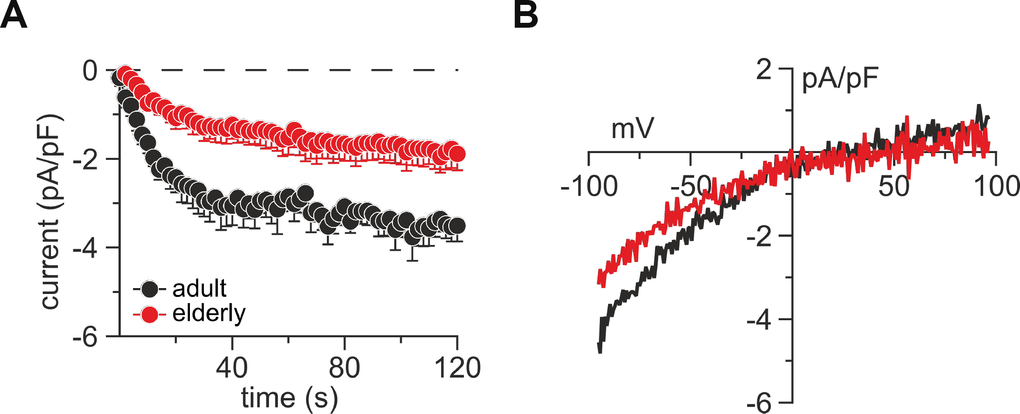 Since mainly Ca2+ release-activated Ca2+ currents (ICRAC) through Orai channels are responsible for Ca2+ influx in T cells, we assessed ICRAC in untouched CD8+ T cells from adult and elderly mice to determine age-related changes (Figure 2). We performed whole-cell patch-clamp experiments by perfusing cells with a high concentration of the Ca2+ chelator BAPTA, and IP3 to deplete the Ca2+ stores. Both adult and elderly CD8+ T cells immediately developed a small, inwardly rectifying current (ICRAC) with a reversal potential above +40 mV. Elderly CD8+ T cells showed reduced currents by 46 % (-1.89 ± 0.37 compared with -3.51 ± 0.36 (pA/pF) at 120 sec, p < 0.0001) (Figure 2A) with the typical inwardly rectifying current-voltage relationship (IV, Figure 2B).