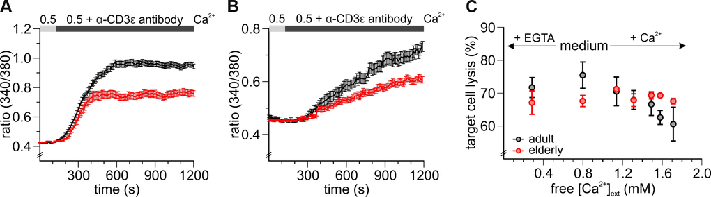 Following T cell activation in mice, several groups have reported a decline in Ca2+ signals with age [25, 26]. However, since the molecular mechanisms of these decreased Ca2+ signals in the context of aging are still elusive, we performed comprehensive assessments of the molecular repertoire governing Ca2+ signals in CD8+ T cells and investigated the influence of varying [Ca2+]ext on the main function of these cells, the lysis of target cells.