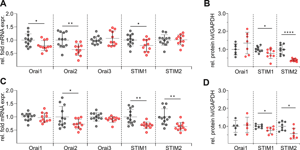 Aging of the immune system is a cumulative phenomenon and contributes to morbidity and mortality in man due to the greater incidence of infection, as well as autoimmune phenomena and cancer in elderly individuals [1–3]. Multiple changes in T cell populations are considered to be critical contributors to age-associated immune dysfunction [4]. A rather unexplored field of this dysfunction in aging is the Ca2+ homeostasis, which especially in T cells, is tightly regulated by an orchestra of channels, pumps, transporters, and receptors [5, 6]. The increase in cytoplasmic free [Ca2+] following T cell receptor activation is an essential element of various activation pathways [7] and necessary for the induction of gene expression in CD8+ T cells [8–11]. In addition, Ca2+ orchestrates the cytotoxicity of CD8+ T cells as the main function of this cell type [12]. For murine and human immune cells, store operated Ca2+ entry (SOCE) is the main pathway for Ca2+ to enter T cells [6, 13, 14]. Highly Ca2+-selective Orai channels and STIM proteins, as Ca2+ sensors, are the key players in SOCE and with their distinct characteristic properties [15, 16] they shape the Ca2+ pattern in T cells [17]. In contrast to the human SOCE components, four different Orai (Orai1, Orai2S, Orai2L, Orai3) proteins [18] and four STIM (STIM1, STIM1L, STIM2.1 and STIM2.2) proteins [19–21] have been identified in the mouse so far, but their role during aging in T cells is completely unknown.