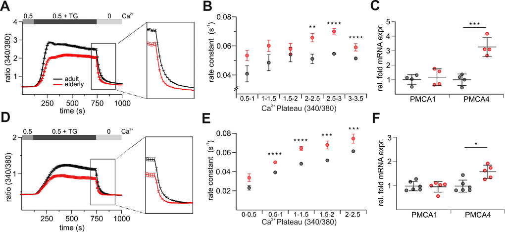 In addition to the influx mechanisms, [Ca2+]int of course depends on Ca2+ efflux that could contribute to the difference in Ca2+ signals of CD8+ T cells from adult and elderly mice. We therefore compared the clearance rates of both untouched (Figure 6A) and stimulated (Figure 6D) cells from elderly and adult mice. Because the rate of Ca2+ extrusion in T cells depends on [Ca2+]int [36, 37], steady-state [Ca2+]int was measured just before Ca2+ removal. The clearance rates were directly calculated as exponential decays after removal of [Ca2+]ext. To isolate the effect of [Ca2+]int we performed iso-cell analysis [37, 38] to compare the rate constant at approximately the same levels of [Ca2+]int. The rate constants from untouched (Figure 6B) and stimulated (Figure 6E) CD8+ T cells isolated from adult and elderly mice were plotted against the respective Ca2+ plateaus. Both the untouched and the stimulated CD8+ T cells from the elderly mice show significantly faster Ca2+ extrusion rates compared to the iso-cells from the adult mice (Figures 6B, 6E, Supplementary Table 5). PMCA1 and PMCA4 are the two, out of four, known PMCA isoforms that are ubiquitously distributed in all tissues and they are also the major Ca2+ extrusion pathway in T cells [37]. PMCA4b is highly expressed in T cells and important to shape [Ca2+]int in T cells [37]. It may therefore contribute to the higher Ca2+ clearance rate seen in elderly CD8+ T cells. We tested the mRNA expression levels of PMCA1 and 4 in untouched and stimulated CD8+ T cells from adult and elderly mice (Figure 6C, 6F). In agreement with the Ca2+ clearance rate analysis, PMCA4b expression was increased in CD8+ cells from elderly compared to adult mice; the values for the PMCA1 isoform remained constant (Figure 6C, 6F). In conclusion, PMCA4b upregulation in CD8+ T cells from elderly mice might contribute to the observed phenotype of reduced [Ca2+]int.