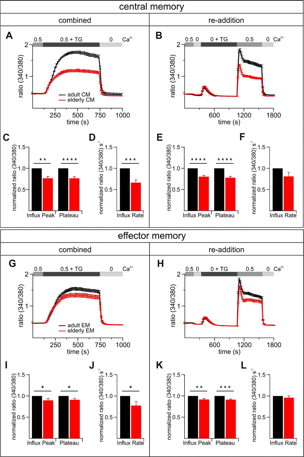 While changes in the (relative) frequency of distinct T cell subsets have been described, nothing is known about Ca2+ signal differences between subsets and if these explain the differences in the total population of CD8+ T cells from elderly and adult mice. In order to characterize the [Ca2+]int mobilization of the most abundant subtypes of stimulated CD8+ T cells, we performed FACS sorting to separate the subtypes of adult and elderly mice and measured their Ca2+ signals. The normalized data of the adult CD8+ T cells subpopulations is summarized in Figure 7. Overall the [Ca2+]int reduction of CD8+ T cells from elderly compared to adult mice is more prominent in the central memory (CM) than the effector memory (EM) population (Figure 7). The CM from elderly mice showed a more drastic Ca2+ influx peak reduction (20 - 25 %) (Figure 7A–7C, 7E) than the EM (~ 10 %) (Figure 7G–7I, 7K). The same applies for the Ca2+ plateaus of CM (~ 25 %) (Figure 7A–7C, 7E) and EM (~ 10 %) (Figure 7G–7I, 7K). The influx rates of both CM and EM showed a significant reduction for the more physiological combined protocol (CM: ~ 35 %; EM: ~ 23 %) (Figure 7D, 7F, 7H, 7J). In conclusion, from the two predominant subtypes of stimulated CD8+ T cells, the CM from elderly mice revealed a more distinctly reduced overall Ca2+ response compared to those of adult animals (Figure 7A, 7B). For the EM this age-related reduction was less pronounced (Figure 7G, 7H). Considering the percentage distribution of the subpopulations in both age cohorts (Supplementary Figure 1), the CM/EM ratios reflect the Ca2+ signal differences seen in the total population of CD8+ T cells (Figure 3A, 3D).