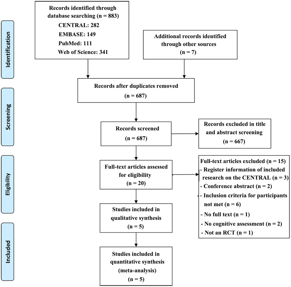 Studies were excluded if they met any one of the following criteria: (1) The publications were abstracts, reviews, conference papers, study protocols, cross-sectional studies, nonhuman (in vitro and animal) studies or papers that did not report on any outcome of interest; (2) No post-intervention or change from baseline on scale scores of cognition was reported, and these data could not be calculated based on the information in the article; (3) The study reported on a sample that overlapped the sample in another study. In this case, only the study with the larger sample size was included.
