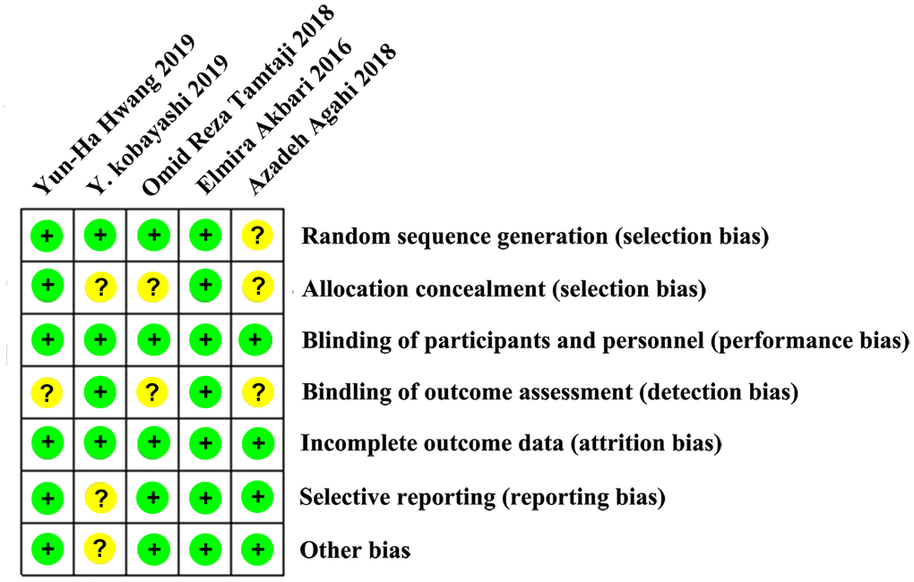 All studies were independently assessed for risk of bias by two authors, with disagreements resolved by discussion to reach consensus. The tool of the Cochrane Handbook for Systematic Reviews of Interventions was used, which included criteria for the following six aspects: random sequence generation, allocation concealment, blindness of participants and personnel, blindness of outcome assessment, incomplete outcome data, selective reporting, and other sources of bias. The results of the risk of bias assessment were pooled into Revman 5.3, and a “summary of risk of bias assessment” table was generated.